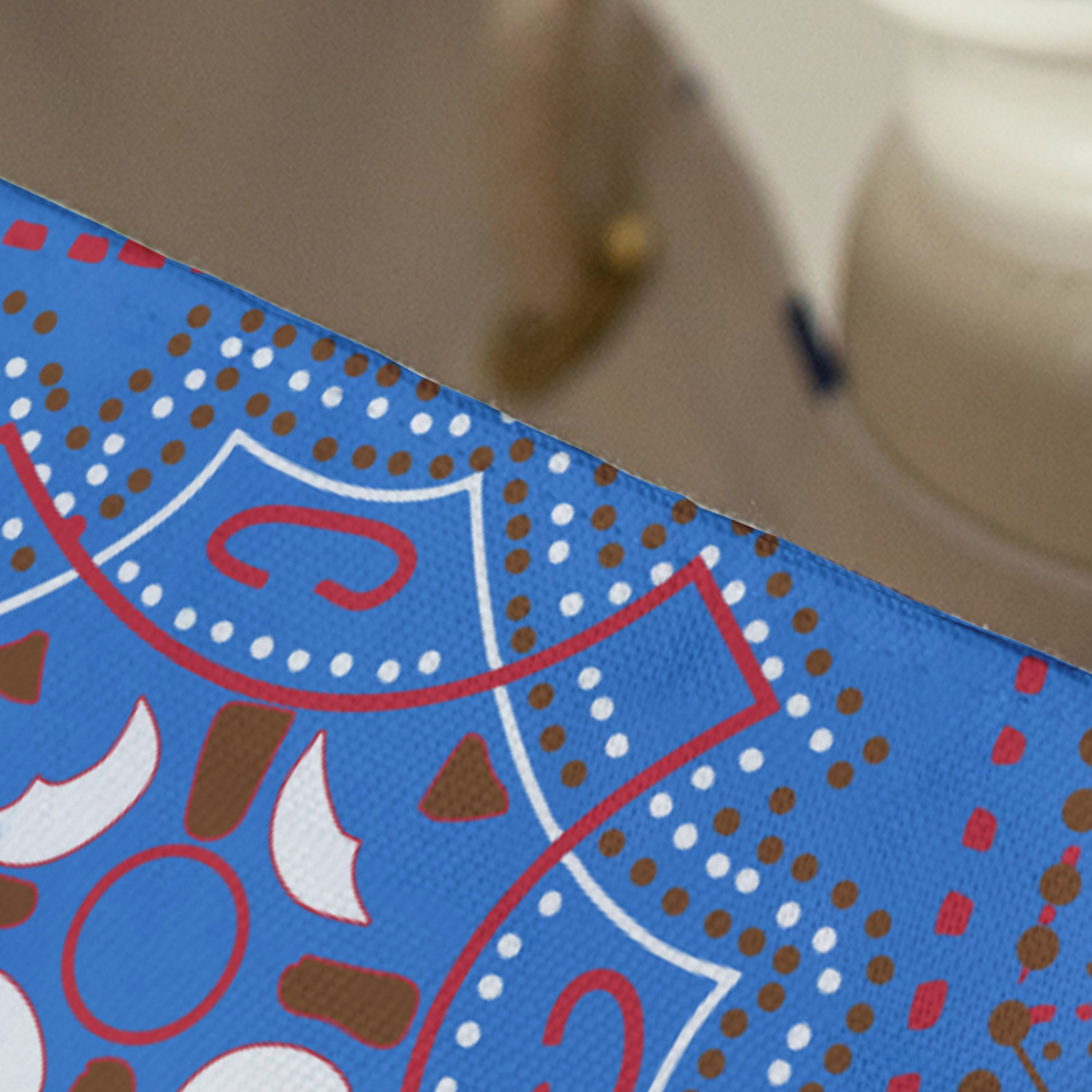 These large totes are handmade i.e. printed, cut and sewn right here in the USA. The canvas like material is printed using dye sublimation; the fabric is then cut and sewn along with a beautiful cream colored lining (to match the rope handles). The brass grommets are then added and the cream colored rope if fed through the grommets and knotted.