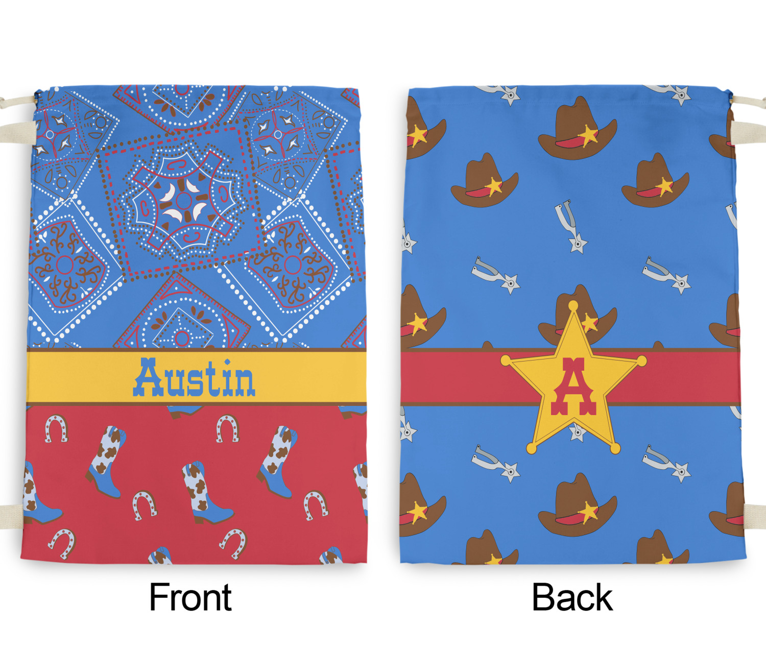 Carry your laundry in style with these customized laundry bags. Available in two sizes, featuring a natural colored woven strap and a cinch cord, these bags hold a lot of clothes or anything else you want to fit in them.