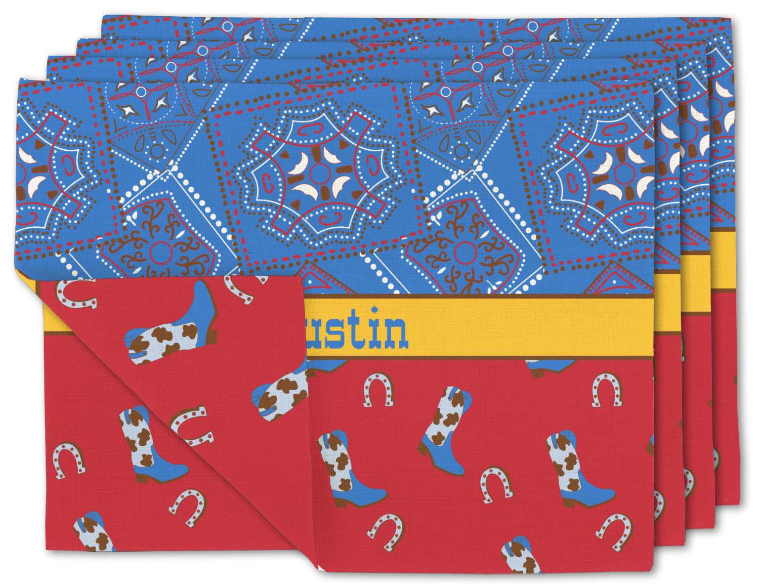 This design has a wild west theme and features a blue bandana print at the top half,and red with cowboy boots and horseshoes on the bottom. The coordinating design is blue, has a yellow ribbon and a sheriff's star in the middle, and cowboy hats and spurs in the background print.