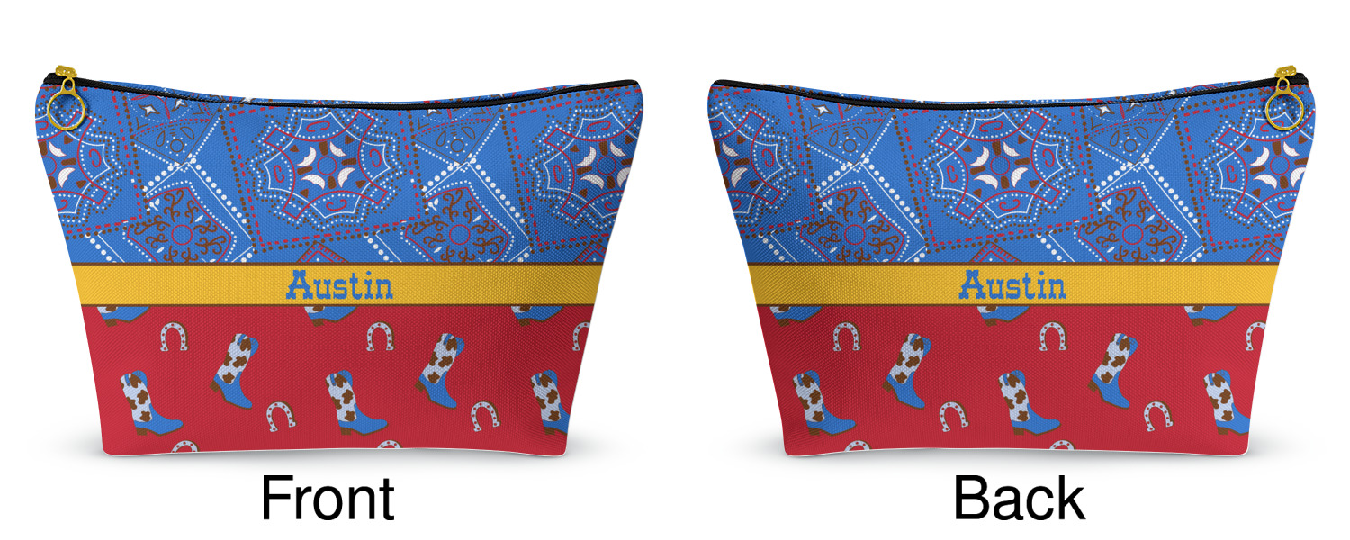 This design has a wild west theme and features a blue bandana print at the top half,and red with cowboy boots and horseshoes on the bottom. The coordinating design is blue, has a yellow ribbon and a sheriff's star in the middle, and cowboy hats and spurs in the background print.