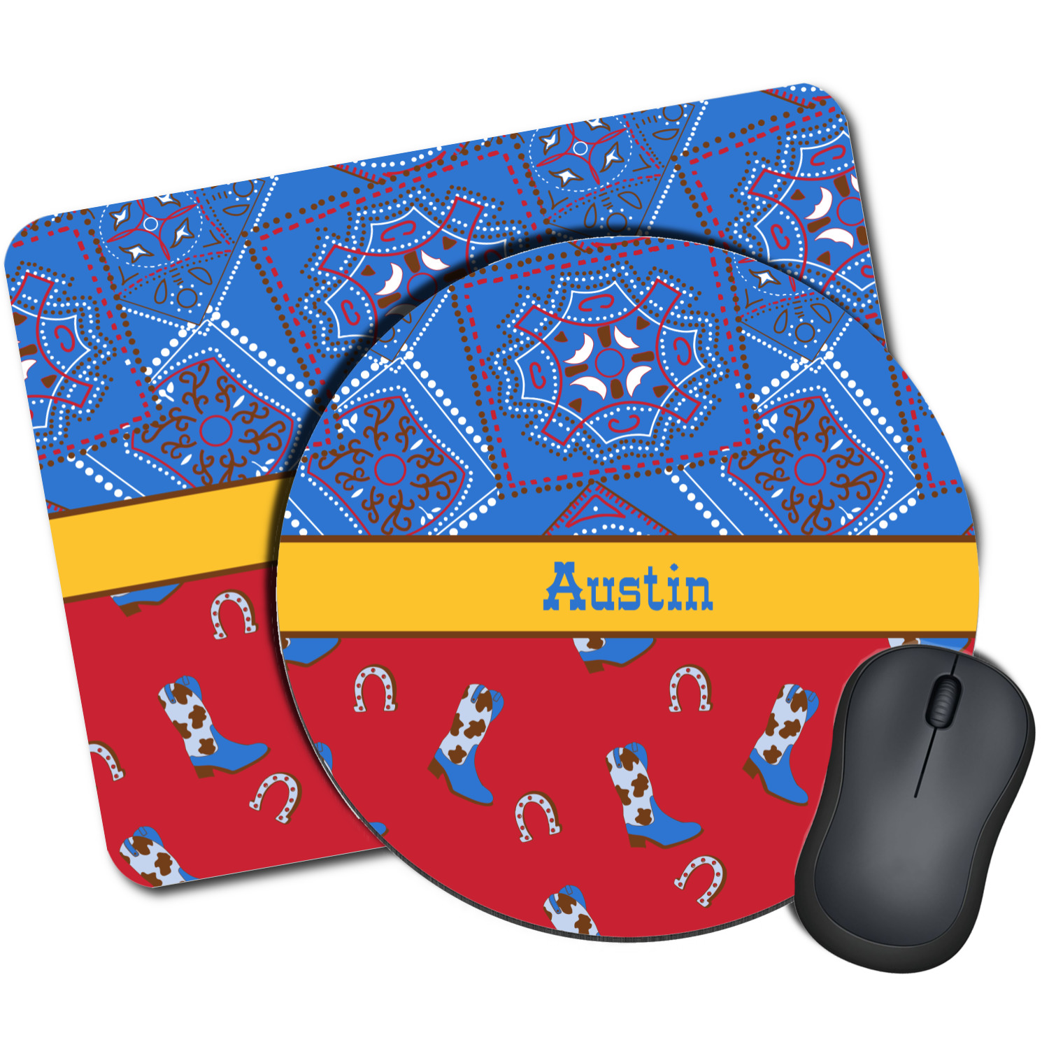 This design has a wild west theme and features a blue bandana print at the top half,and red with cowboy boots and horseshoes on the bottom. The coordinating design is blue, has a yellow ribbon and a sheriff's star in the middle, and cowboy hats and spurs in the background print.
