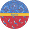 This design has a wild west theme and features a blue bandana print at the top half,and red with cowboy boots and horseshoes on the bottom. The coordinating design is blue, has a yellow ribbon and a sheriff's star in the middle, and cowboy hats and spurs in the background print.
