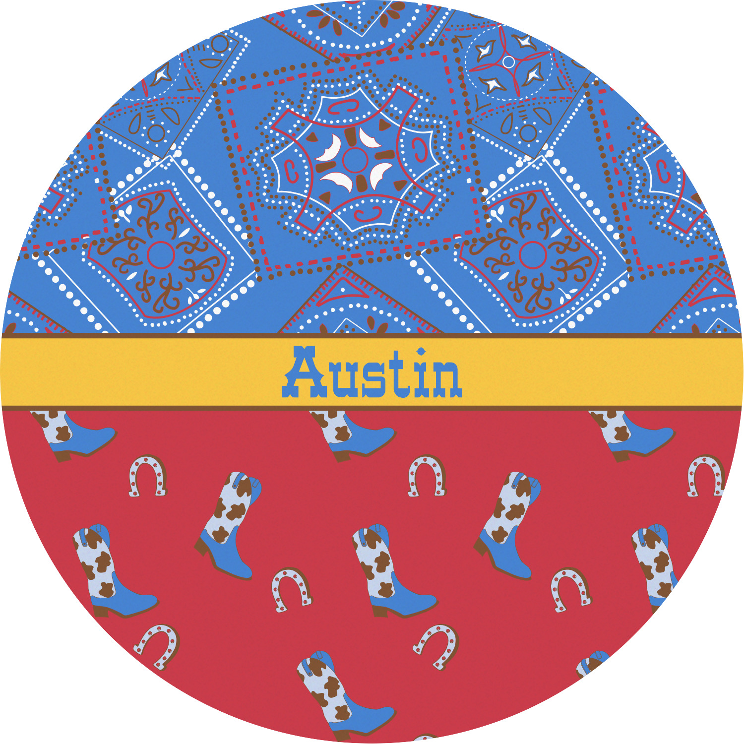 This design has a wild west theme and features a blue bandana print at the top half,and red with cowboy boots and horseshoes on the bottom. The coordinating design is blue, has a yellow ribbon and a sheriff's star in the middle, and cowboy hats and spurs in the background print.