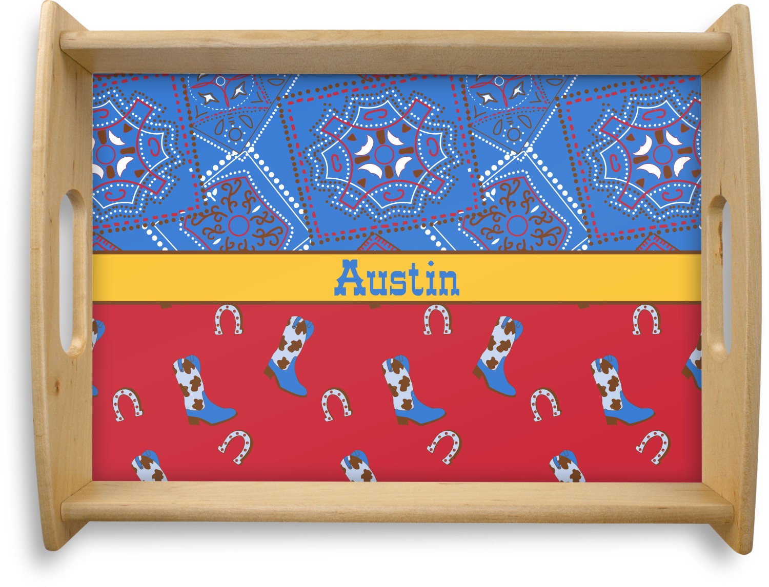 This serving tray with handles features square edges and two rounded sides, creating a very modern look. Each side is fabricated from a beautifully cut, natural wood. The bottom of the interior of the tray displays your customized design in bright, vibrant color. The tray is sold in both a black color and a natural wood look. Each variation of the wood serving tray has two sizes: Small, which is 14" x 10" x 2.25", and Large, which is 19.5" x 13.5" x 2.75".