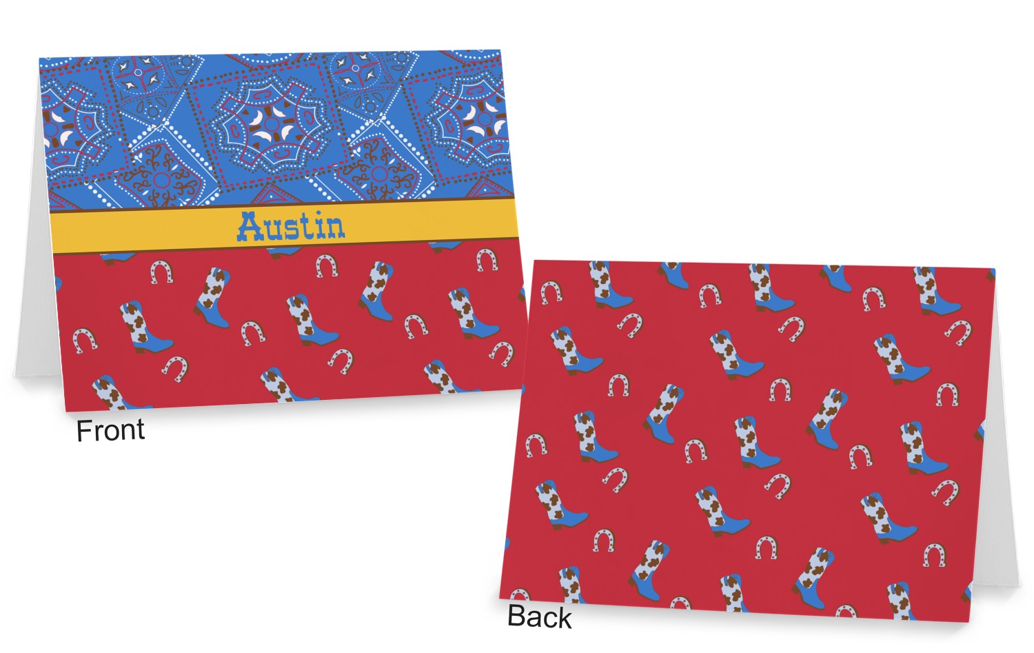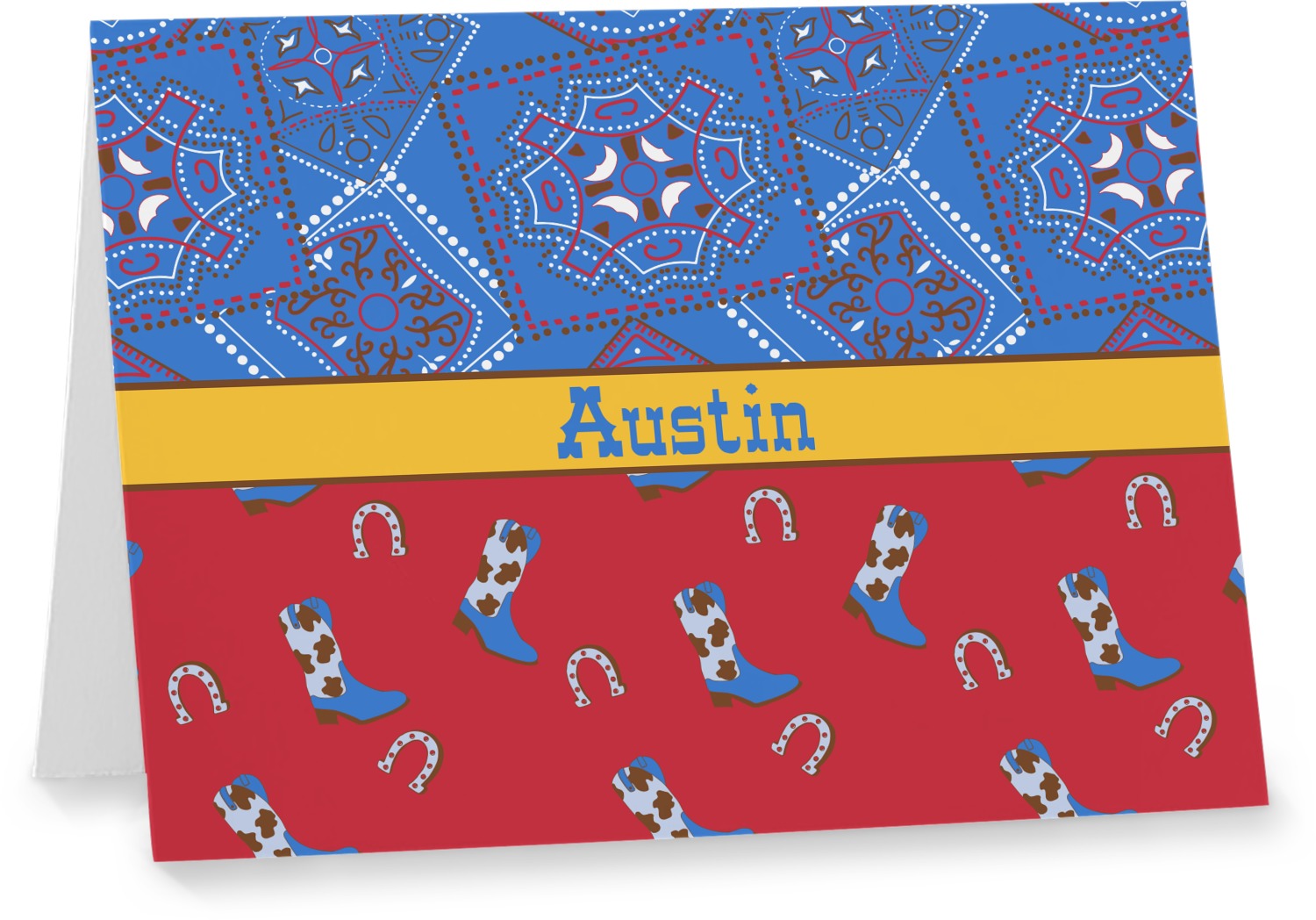 This design has a wild west theme and features a blue bandana print at the top half,and red with cowboy boots and horseshoes on the bottom. The coordinating design is blue, has a yellow ribbon and a sheriff's star in the middle, and cowboy hats and spurs in the background print.