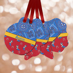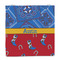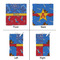 This design has a wild west theme and features a blue bandana print at the top half,and red with cowboy boots and horseshoes on the bottom. The coordinating design is blue, has a yellow ribbon and a sheriff's star in the middle, and cowboy hats and spurs in the background print.