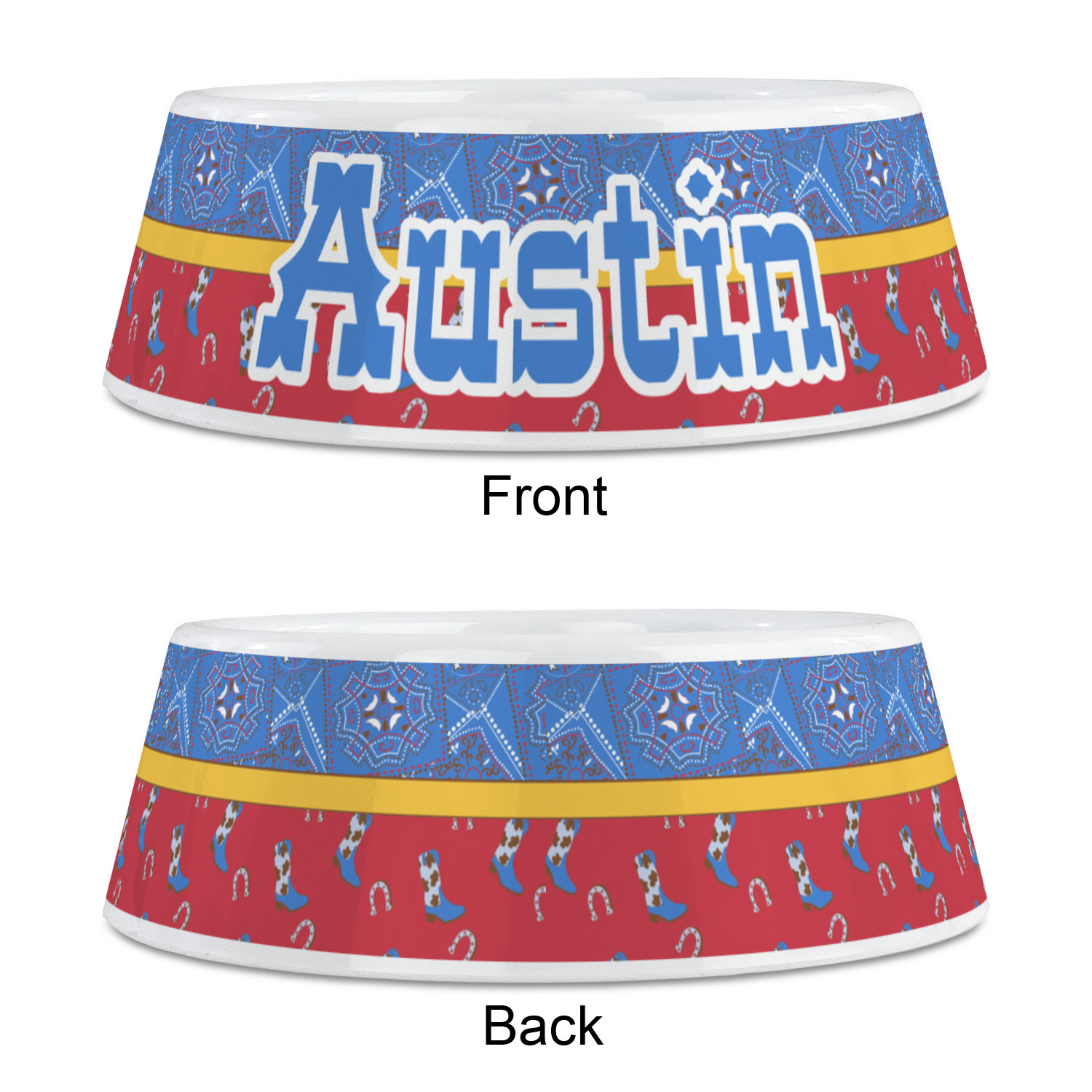 This design has a wild west theme and features a blue bandana print at the top half,and red with cowboy boots and horseshoes on the bottom. The coordinating design is blue, has a yellow ribbon and a sheriff's star in the middle, and cowboy hats and spurs in the background print.