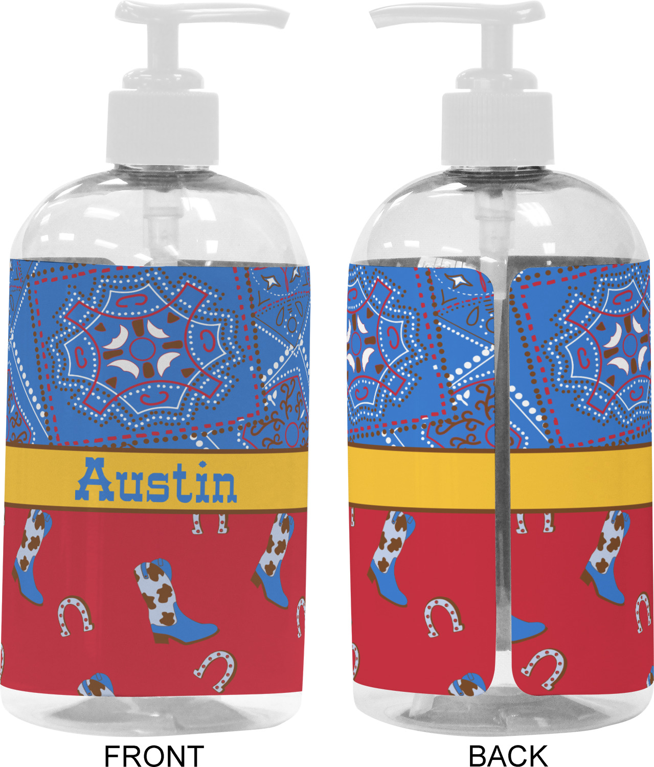 We adhere and wrap your custom printed design around the clear plastic bottle; there is a slight gap at the back for you to see the liquid level. Your design is printed on high gloss vinyl with eco-solvent inks and completely waterproof and will not fade or deteriorate over time. The vinyl is machine cut and adhered by hand to the clear plastic bottle.