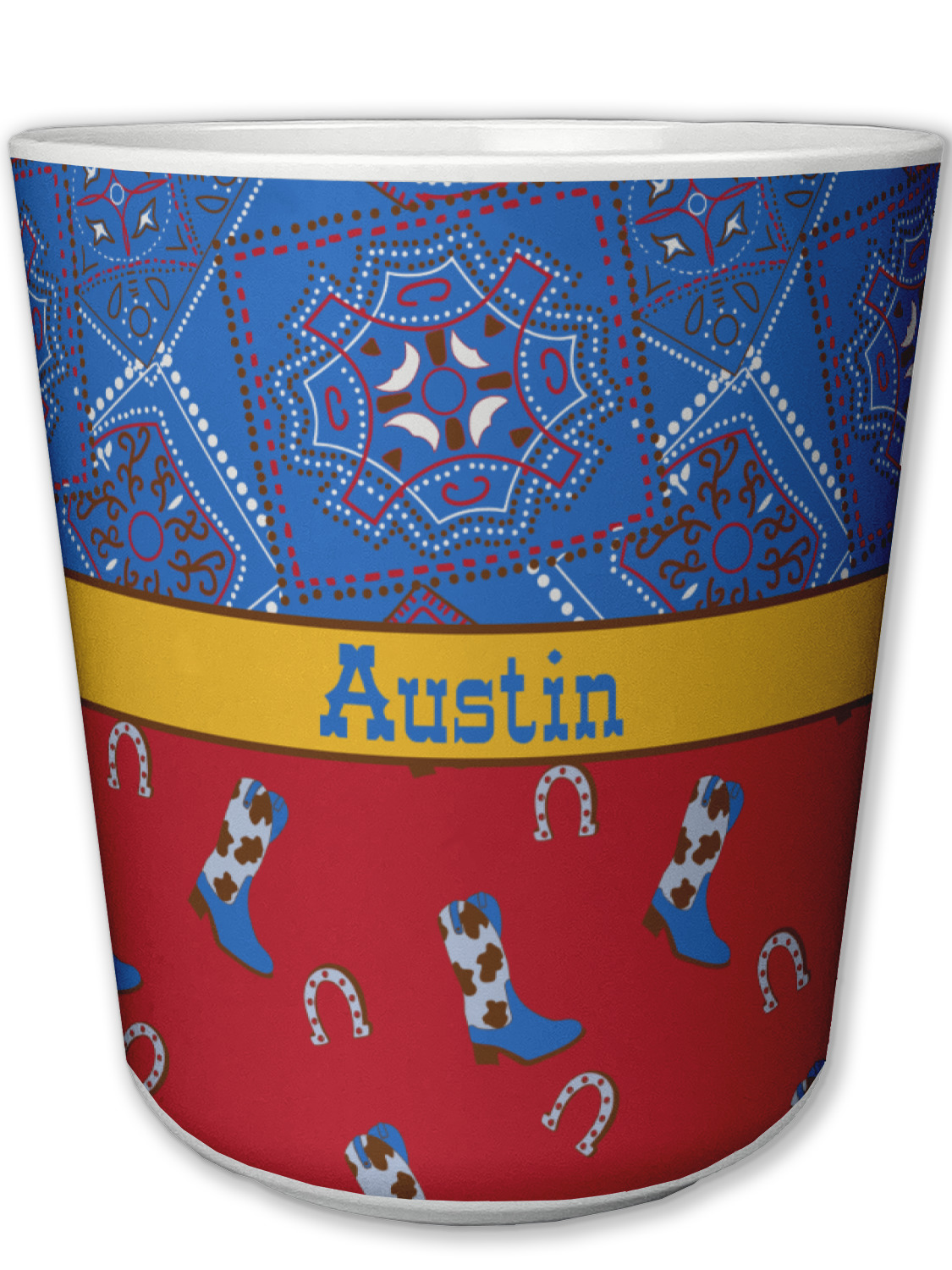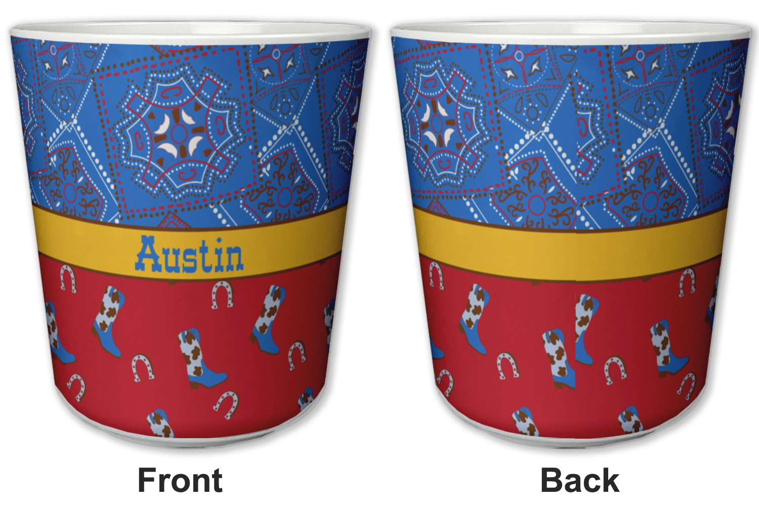 This design has a wild west theme and features a blue bandana print at the top half,and red with cowboy boots and horseshoes on the bottom. The coordinating design is blue, has a yellow ribbon and a sheriff's star in the middle, and cowboy hats and spurs in the background print.