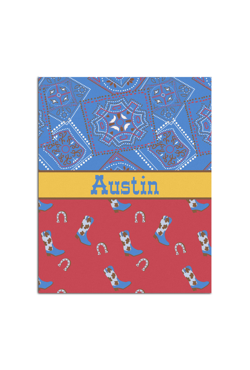 This design has a wild west theme and features a blue bandana print at the top half,and red with cowboy boots and horseshoes on the bottom. The coordinating design is blue, has a yellow ribbon and a sheriff's star in the middle, and cowboy hats and spurs in the background print.