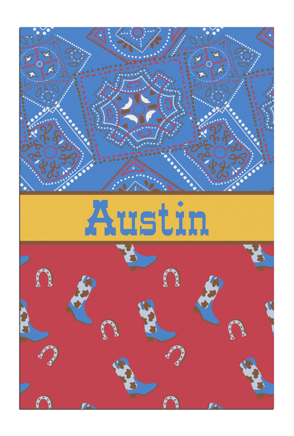 This design has a wild west theme and features a blue bandana print at the top half,and red with cowboy boots and horseshoes on the bottom. The coordinating design is blue, has a yellow ribbon and a sheriff's star in the middle, and cowboy hats and spurs in the background print.