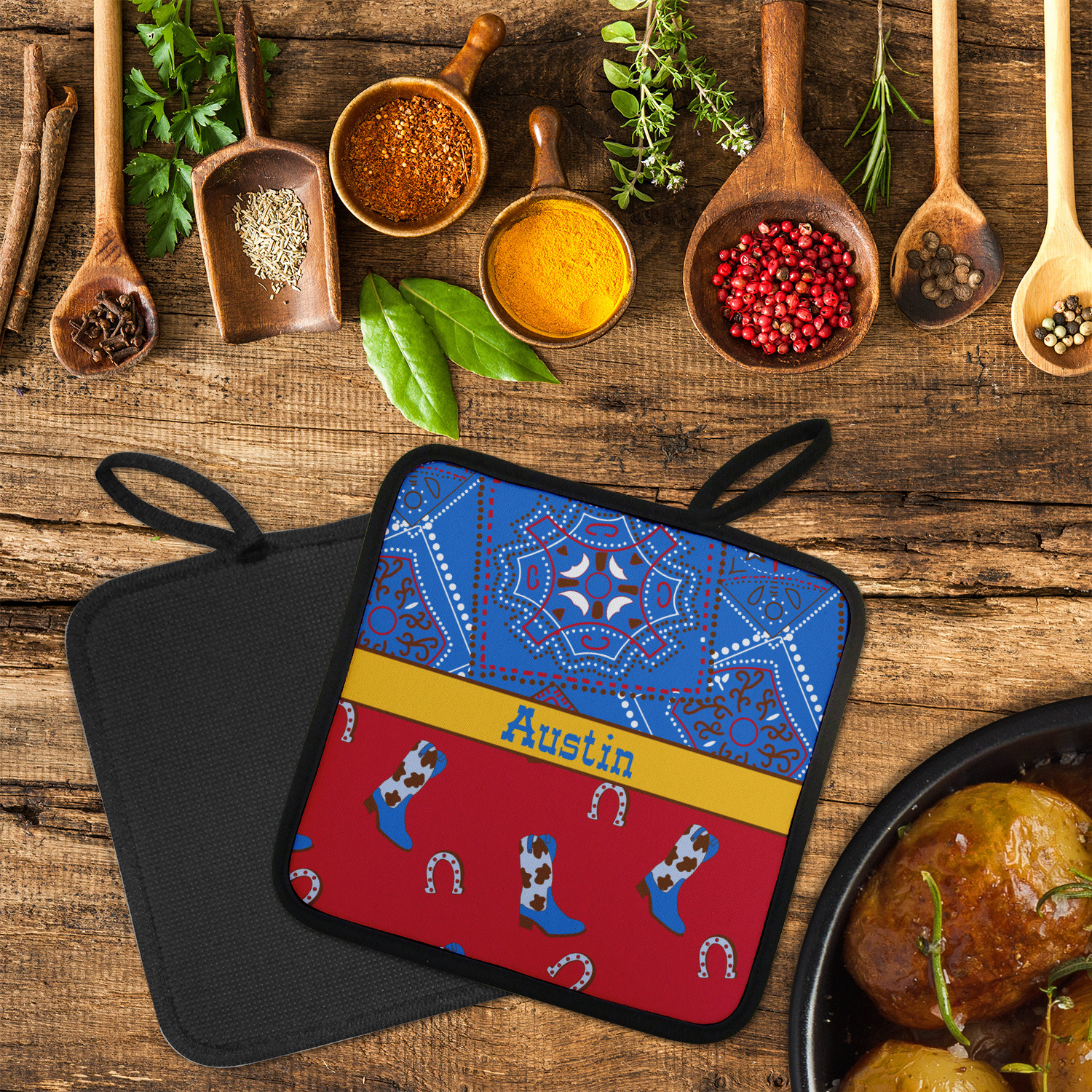 Our personalized pot holders feature a neoprene front that displays your personalization in vibrant colors. The backing of the hot pot holder is rubberized; the textured backing allows you to have a great grip when using this custom pot holder. The two materials are joined with a sleek, black trim, and the holder also includes an attached loop for hanging and storage. The pot holder is approximately 8.75 inches by 8.75 inches and 0.25 inches tall, while the fabric loop is 2.5 inches long. You can purchase a kitchen pot holder by itself or as a set of 2. We also offer a set including one pot holder and one oven mitt.