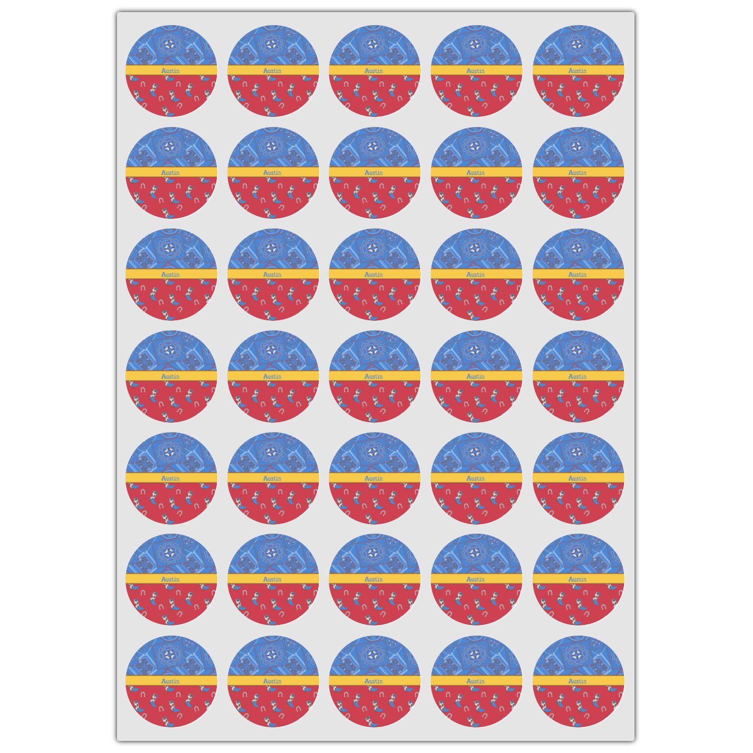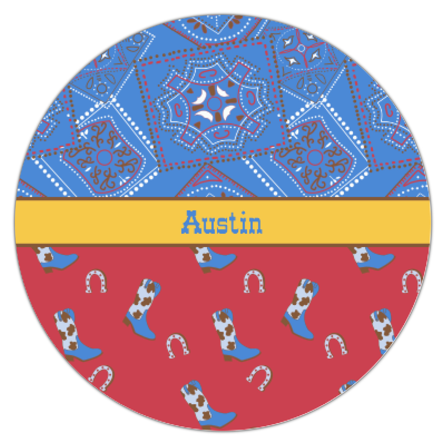 This design has a wild west theme and features a blue bandana print at the top half,and red with cowboy boots and horseshoes on the bottom. The coordinating design is blue, has a yellow ribbon and a sheriff's star in the middle, and cowboy hats and spurs in the background print.