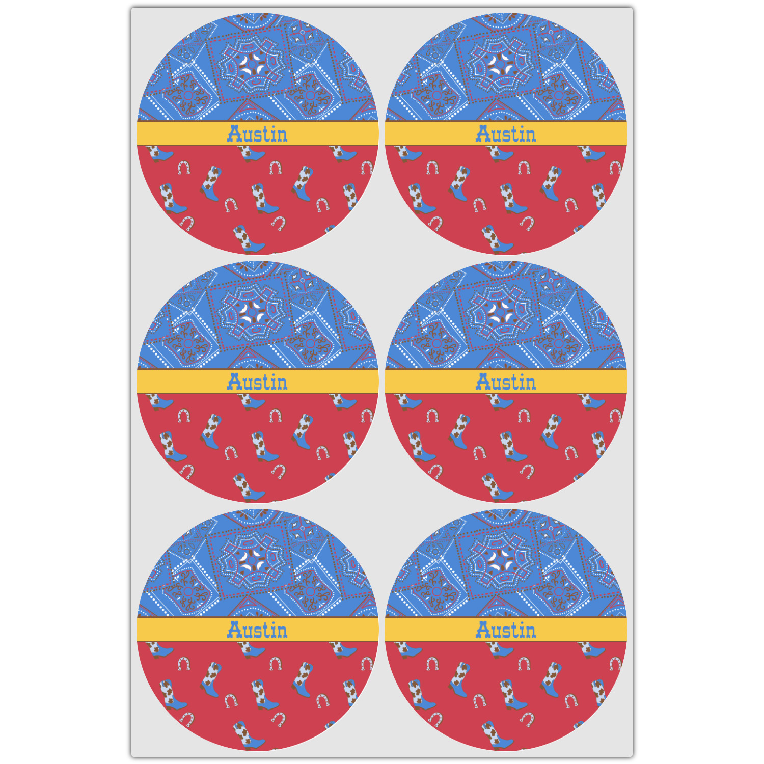 This design has a wild west theme and features a blue bandana print at the top half,and red with cowboy boots and horseshoes on the bottom. The coordinating design is blue, has a yellow ribbon and a sheriff's star in the middle, and cowboy hats and spurs in the background print.