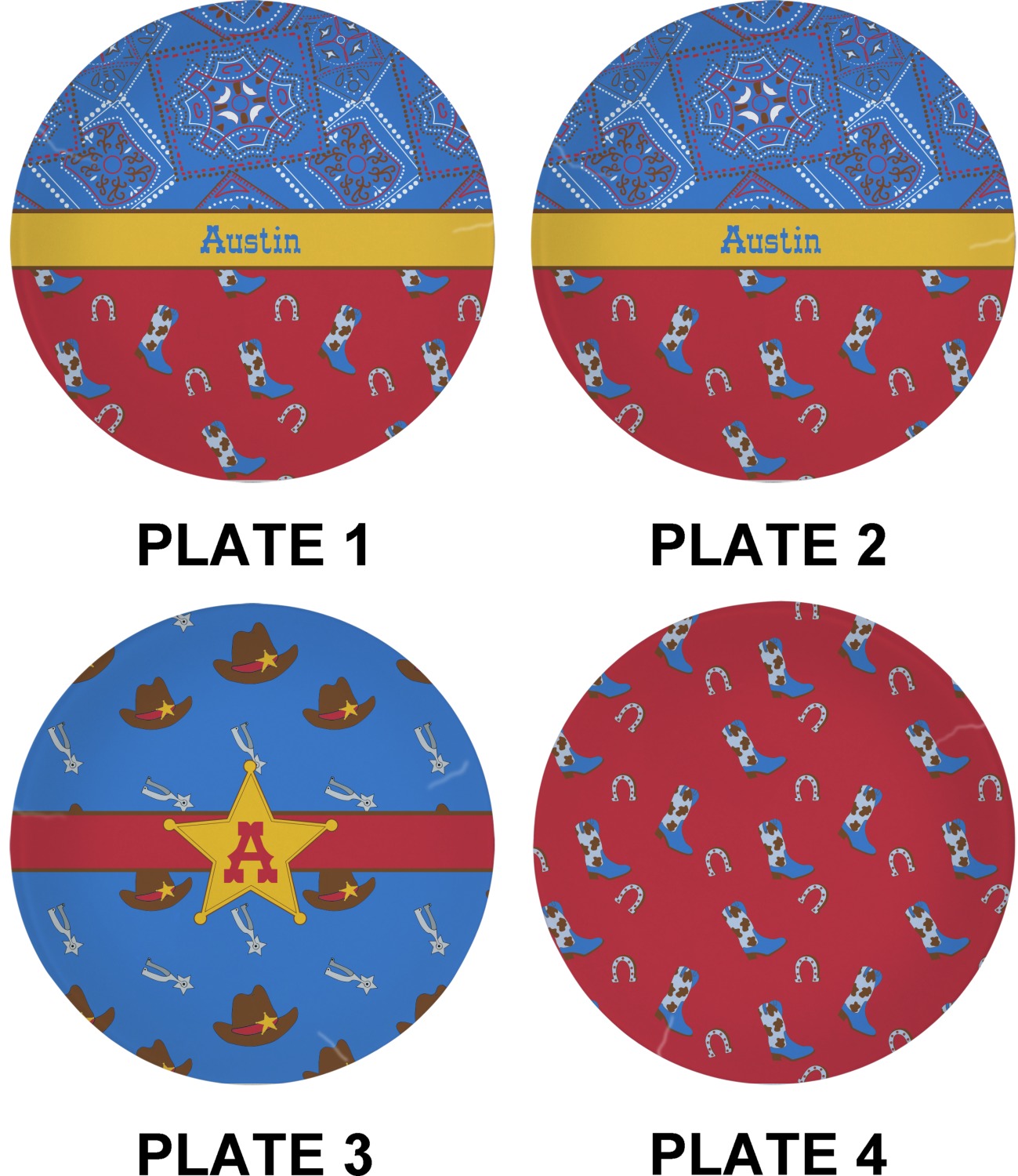 This design has a wild west theme and features a blue bandana print at the top half,and red with cowboy boots and horseshoes on the bottom. The coordinating design is blue, has a yellow ribbon and a sheriff's star in the middle, and cowboy hats and spurs in the background print.