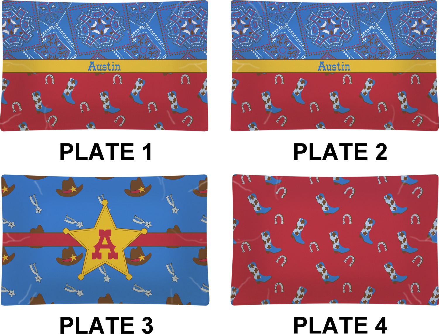 This design has a wild west theme and features a blue bandana print at the top half,and red with cowboy boots and horseshoes on the bottom. The coordinating design is blue, has a yellow ribbon and a sheriff's star in the middle, and cowboy hats and spurs in the background print.