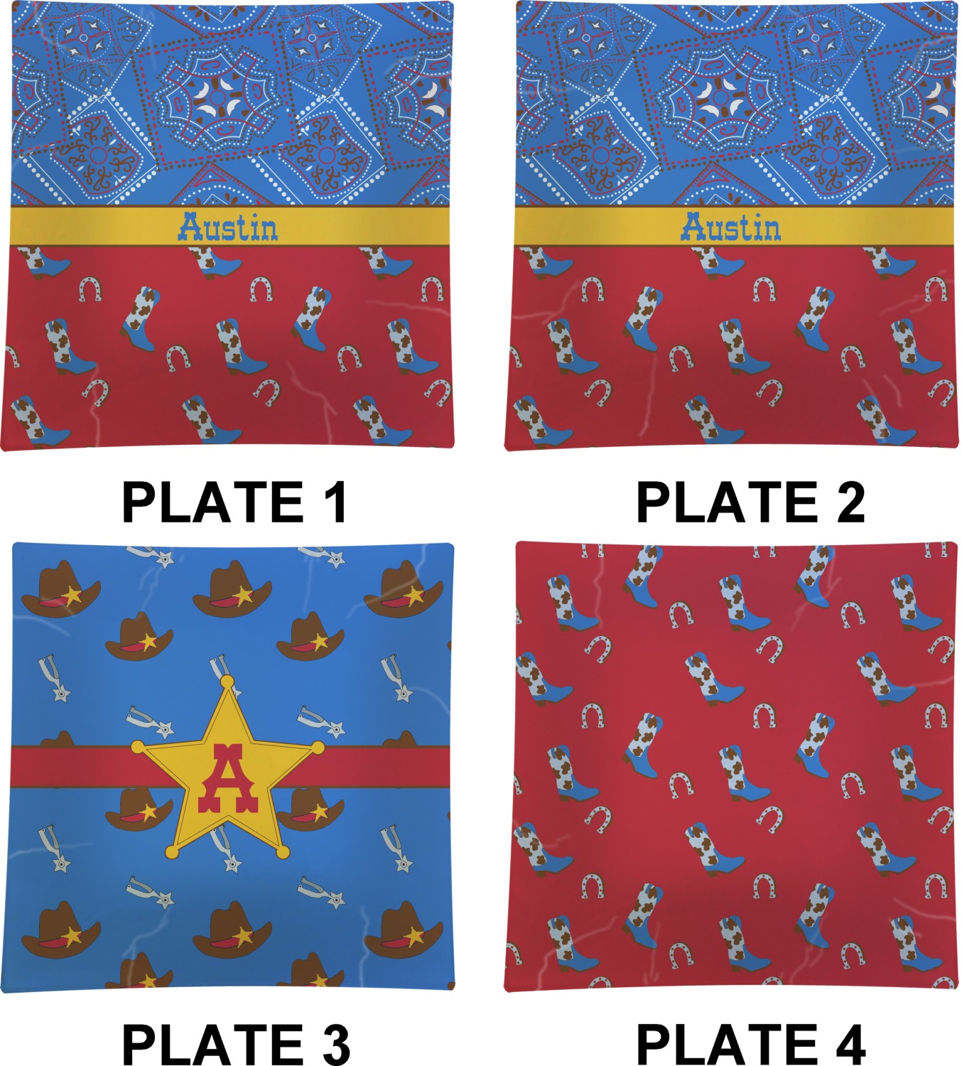 This design has a wild west theme and features a blue bandana print at the top half,and red with cowboy boots and horseshoes on the bottom. The coordinating design is blue, has a yellow ribbon and a sheriff's star in the middle, and cowboy hats and spurs in the background print.