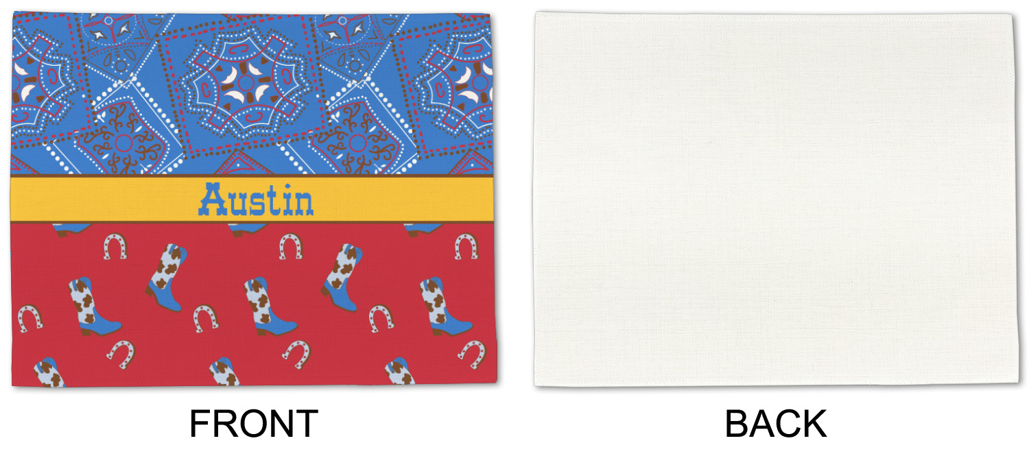 This design has a wild west theme and features a blue bandana print at the top half,and red with cowboy boots and horseshoes on the bottom. The coordinating design is blue, has a yellow ribbon and a sheriff's star in the middle, and cowboy hats and spurs in the background print.