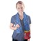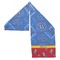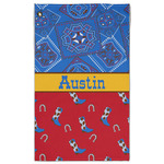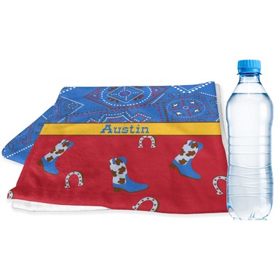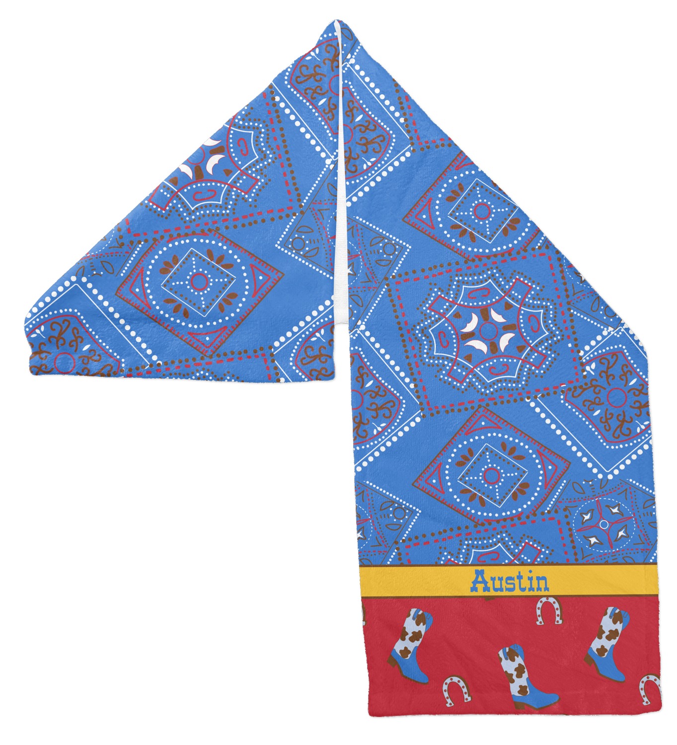 This design has a wild west theme and features a blue bandana print at the top half,and red with cowboy boots and horseshoes on the bottom. The coordinating design is blue, has a yellow ribbon and a sheriff's star in the middle, and cowboy hats and spurs in the background print.