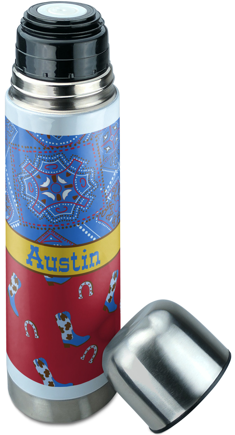 Manufactured from stainless steel, this thermos is built durably and double-walled insulated to preserve the temperature of your drink for hours. It also features a screw off lid that is made to also function as a small cup. Upon unscrewing this part of the thermos bottle, a pop-open, pour feature emerges. This feature allows you to slowly pour your beverage into your lid, ensuring a steady, controlled pour into your lid or other cup. With a capacity of 25 ounces, these large thermoses can hold several servings of your favorite beverage. Your customization is displayed all around the bottle with bright, vibrant color.