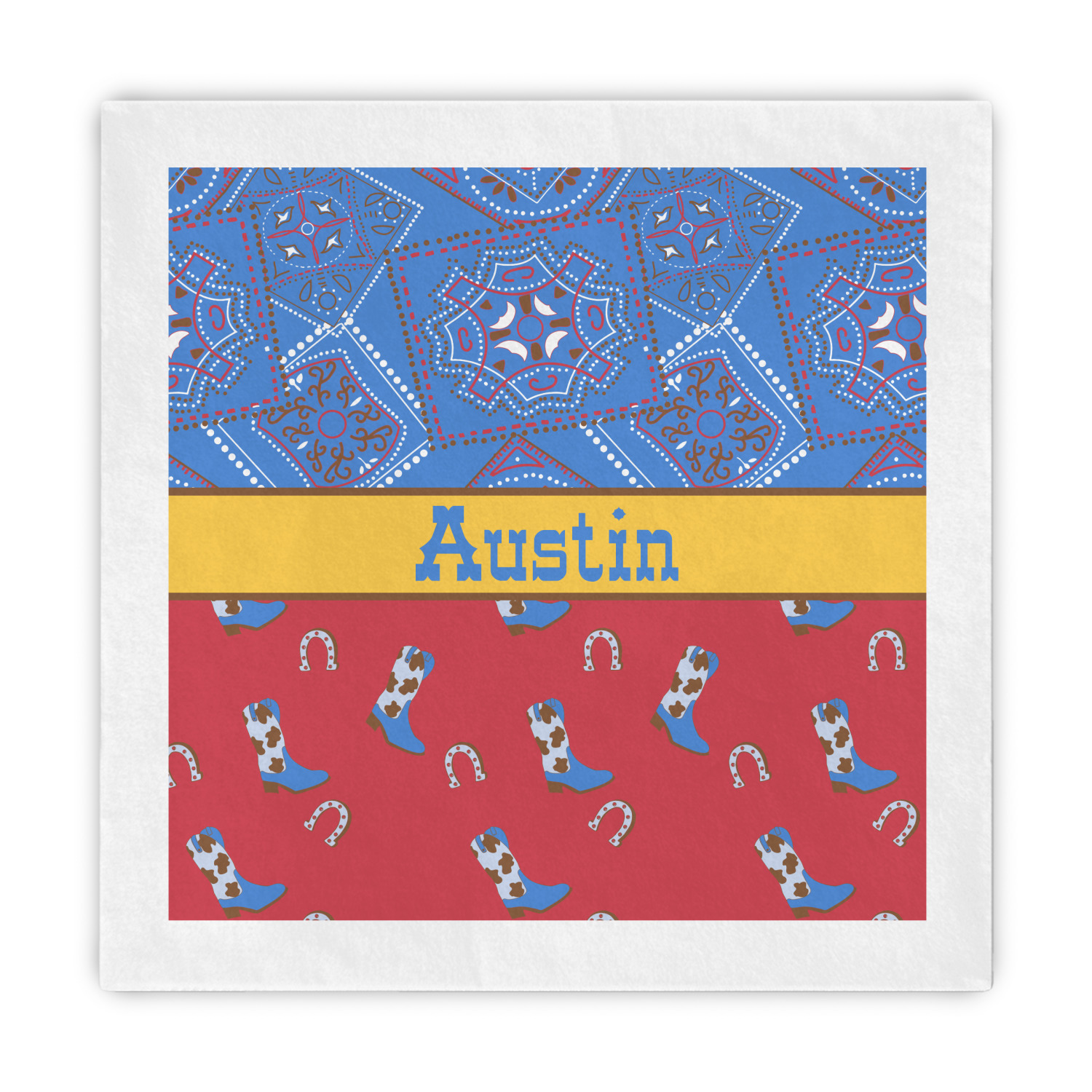 This design has a wild west theme and features a blue bandana print at the top half,and red with cowboy boots and horseshoes on the bottom. The coordinating design is blue, has a yellow ribbon and a sheriff's star in the middle, and cowboy hats and spurs in the background print.