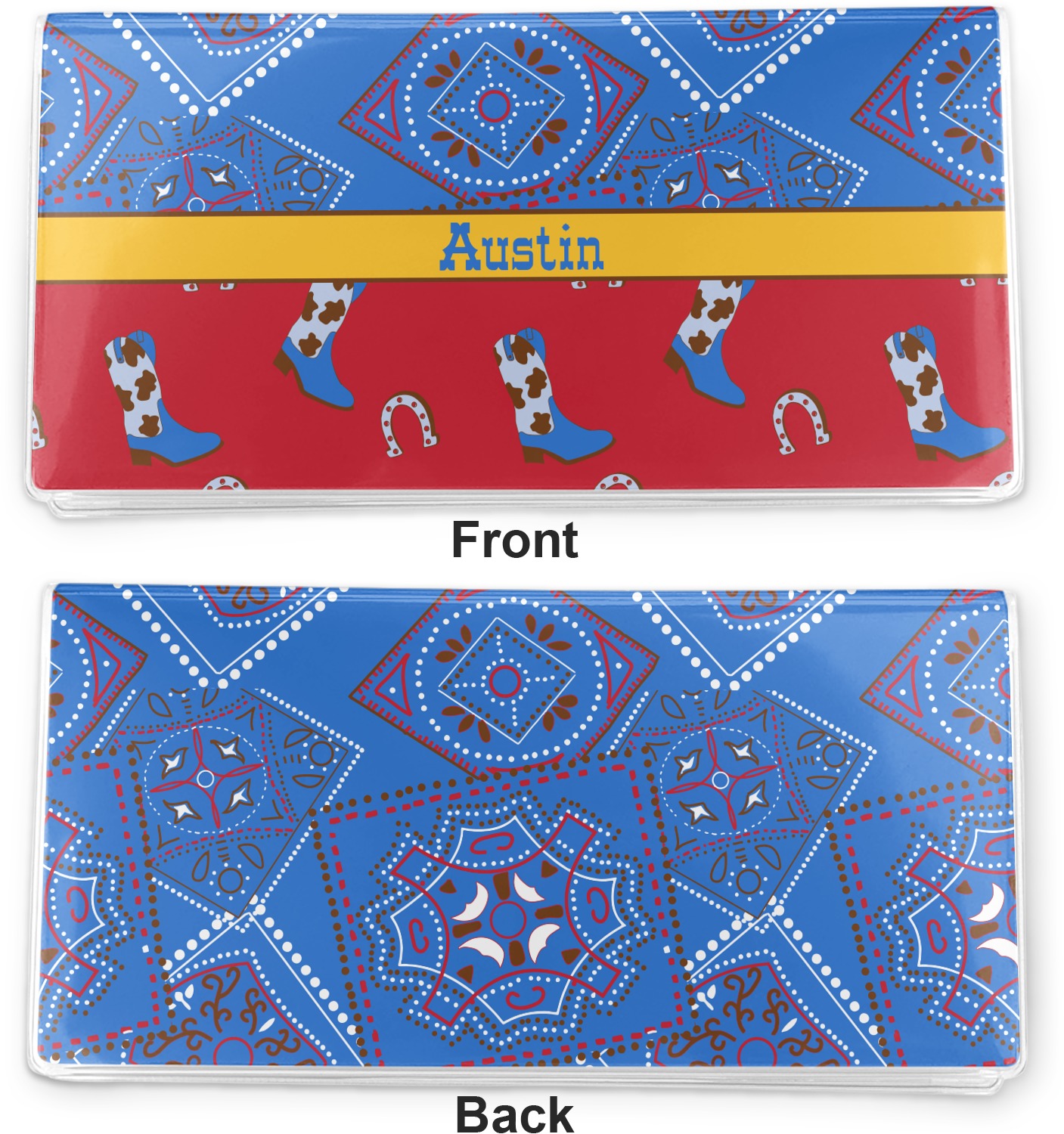 This design has a wild west theme and features a blue bandana print at the top half,and red with cowboy boots and horseshoes on the bottom. The coordinating design is blue, has a yellow ribbon and a sheriff's star in the middle, and cowboy hats and spurs in the background print.