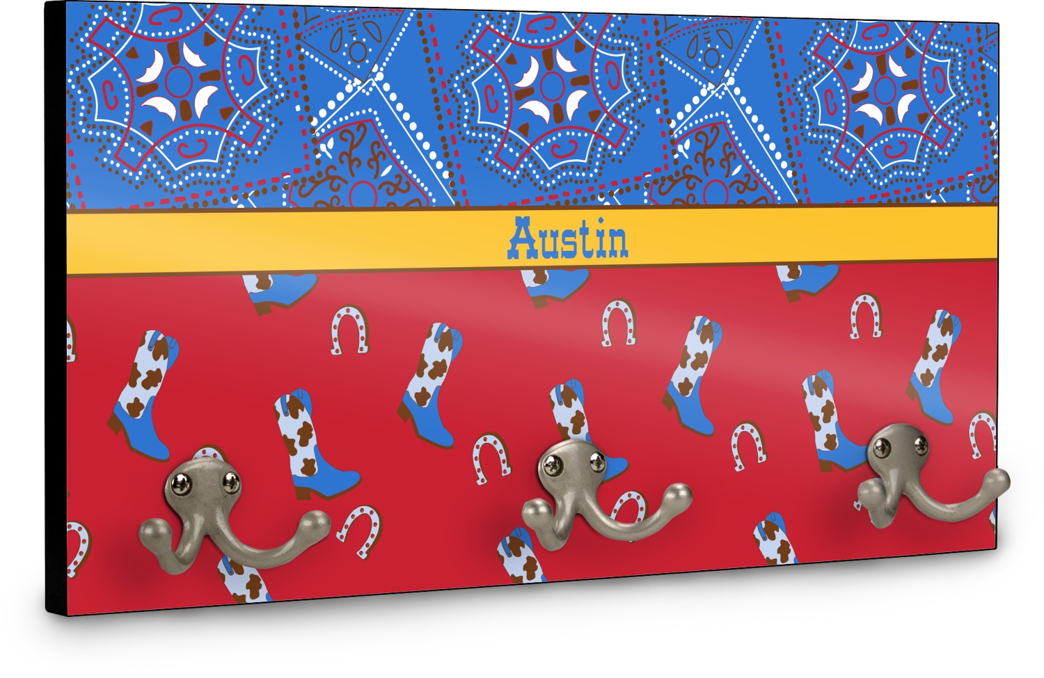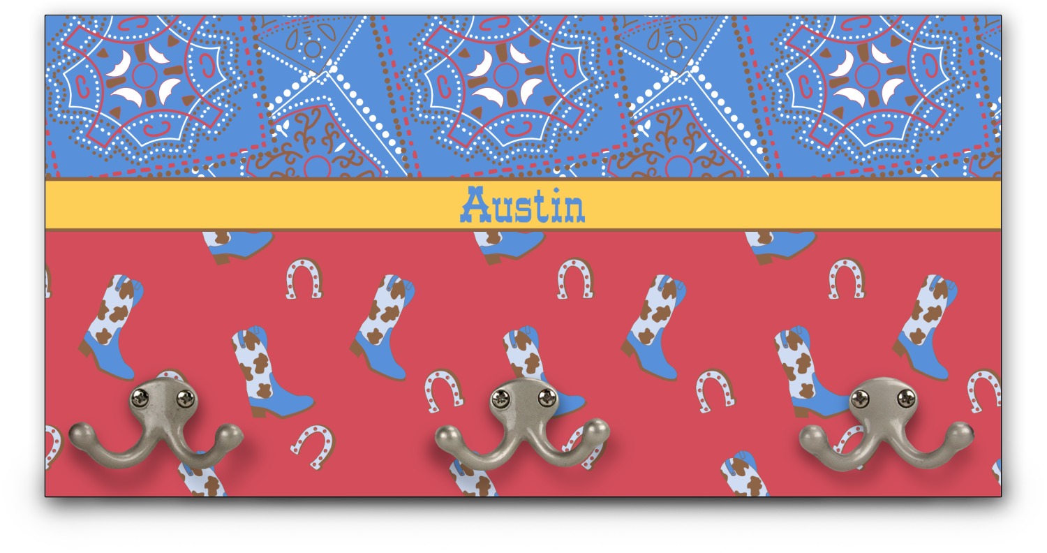 This coat rack is the perfect way to add some personality to your wall or entryway. The board is made of a strong maple that is approximately 16" x 8". The three 2-prong hooks are a sturdy metal that have three screws attaching them to the board. Your design is printed right onto the front of the board while the back and sides are a simple black.
