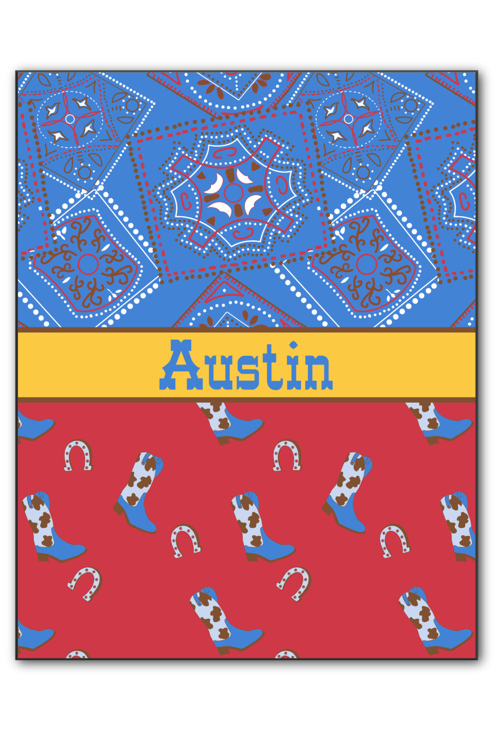 This design has a wild west theme and features a blue bandana print at the top half,and red with cowboy boots and horseshoes on the bottom. The coordinating design is blue, has a yellow ribbon and a sheriff's star in the middle, and cowboy hats and spurs in the background print.