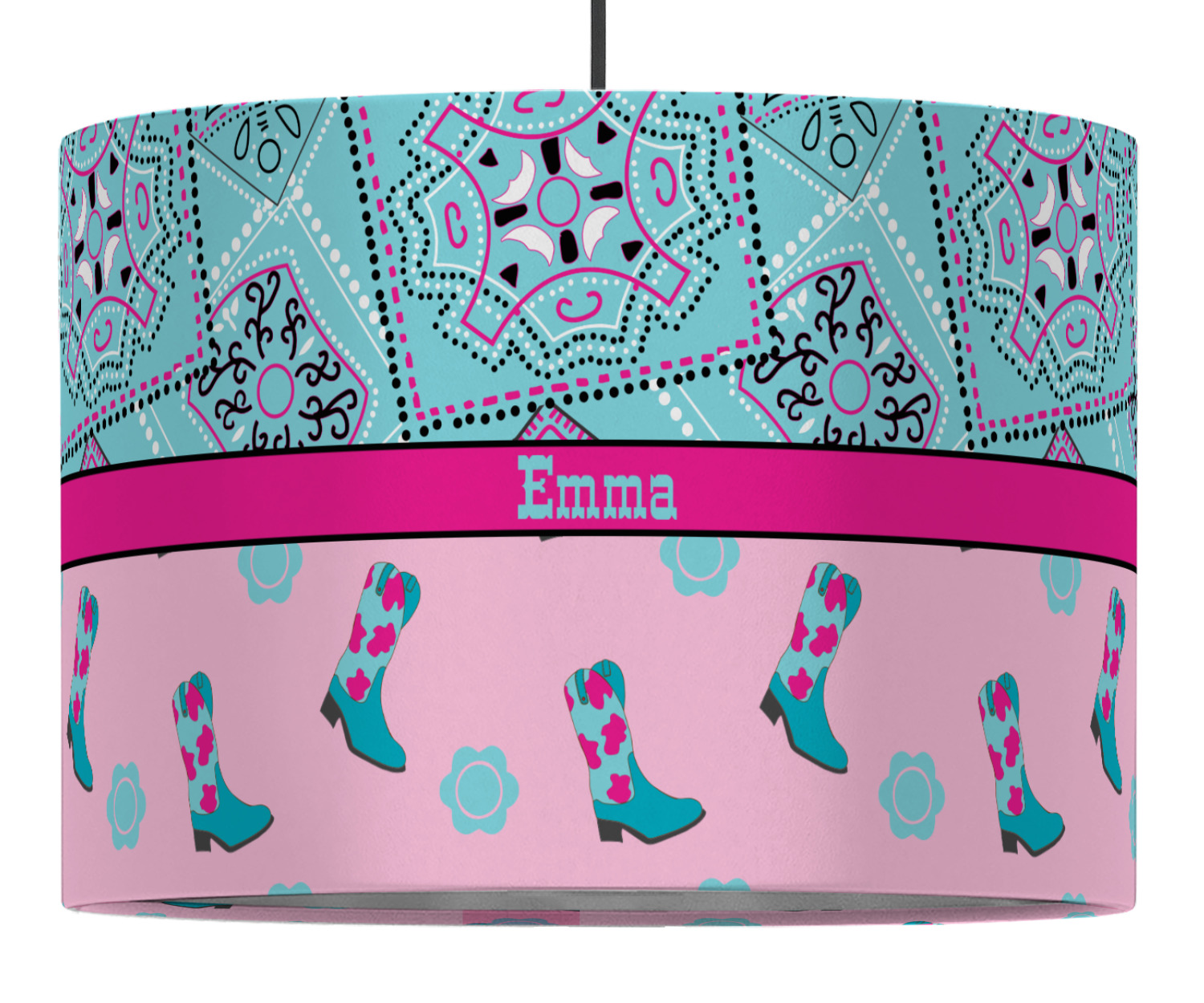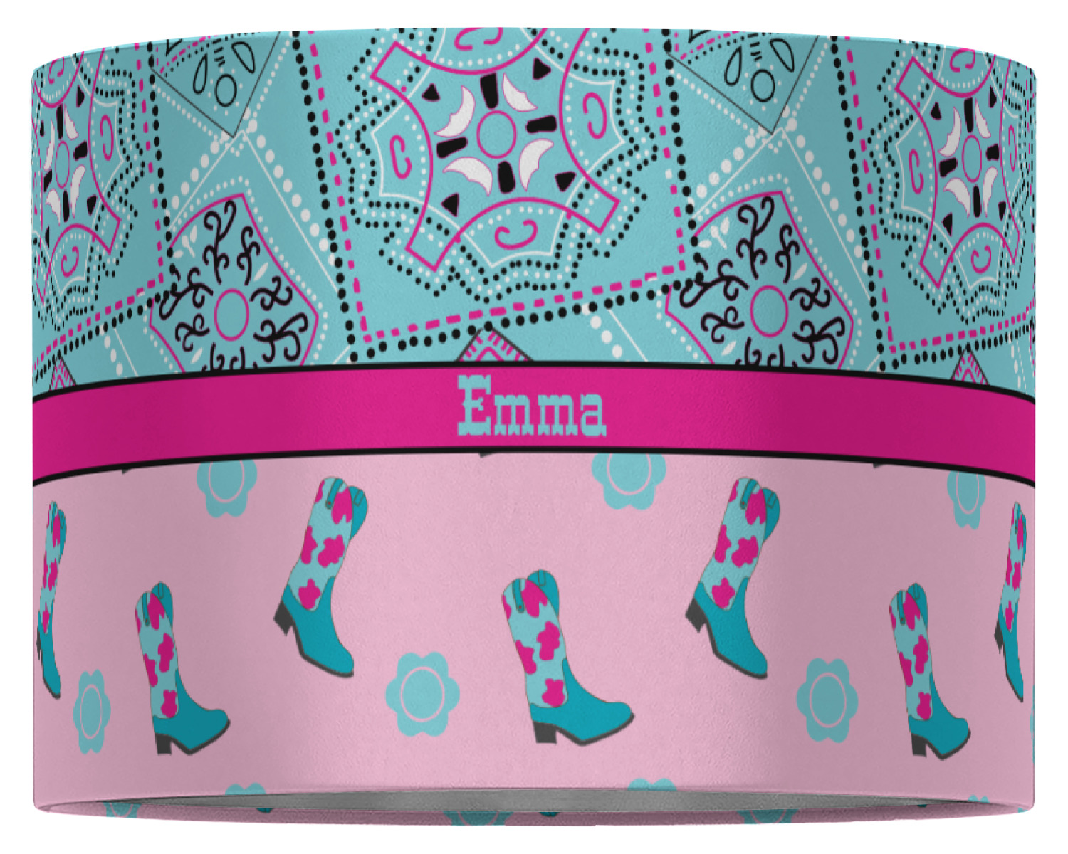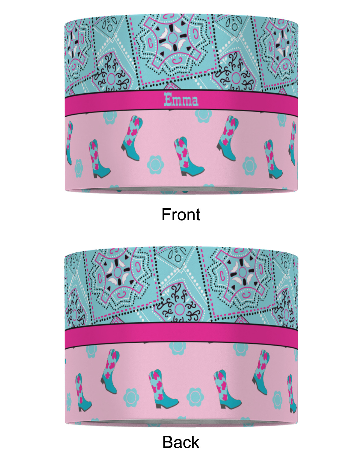 This design has a wild west theme and features a turquoise and pink bandana print on the top half, a pink stripe across the middle, and cowgirl boots and flowers on the bottom. The coordinating design is hot pink, has a turquoise stripe and scalloped circle in the middle, and horseshoes in the background print.