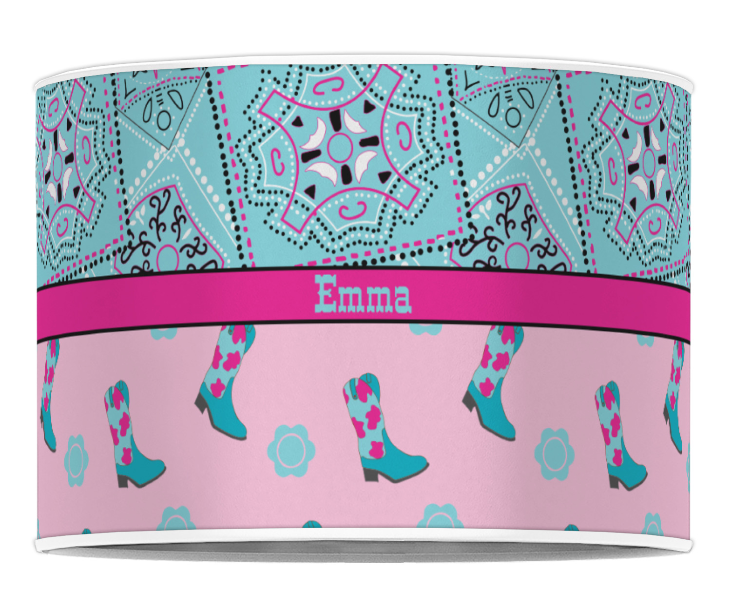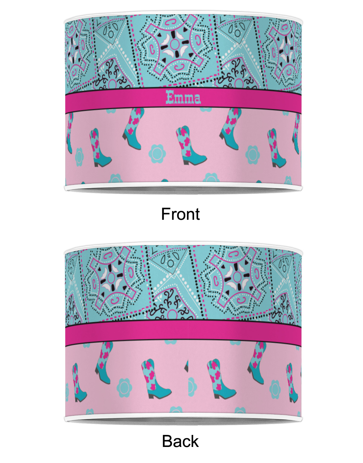 This design has a wild west theme and features a turquoise and pink bandana print on the top half, a pink stripe across the middle, and cowgirl boots and flowers on the bottom. The coordinating design is hot pink, has a turquoise stripe and scalloped circle in the middle, and horseshoes in the background print.