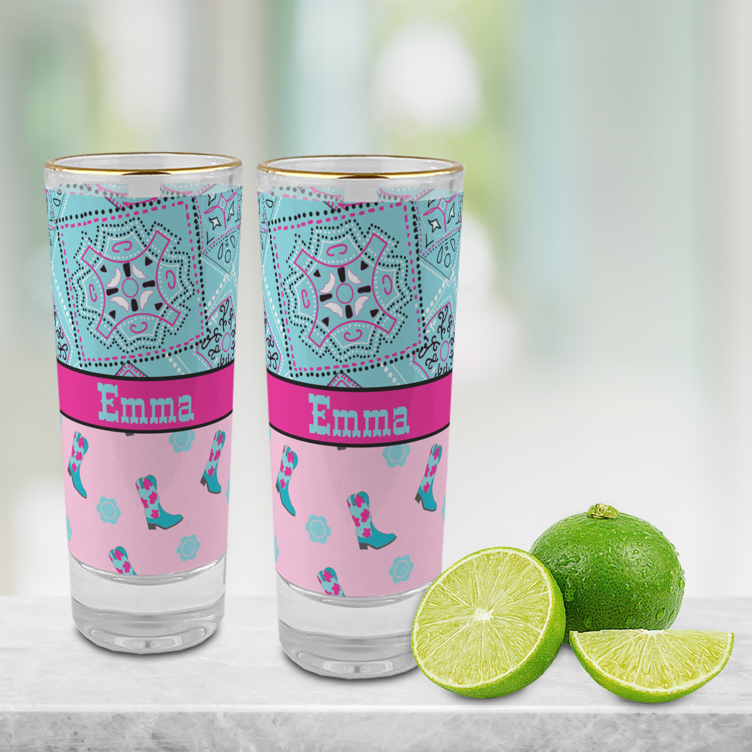 These glass shooter glasses are printed in full color with the design of your choice. These are a tall shooter 2 oz size and stand 4" tall. The print is a full wrap design to boldly display your personalization.