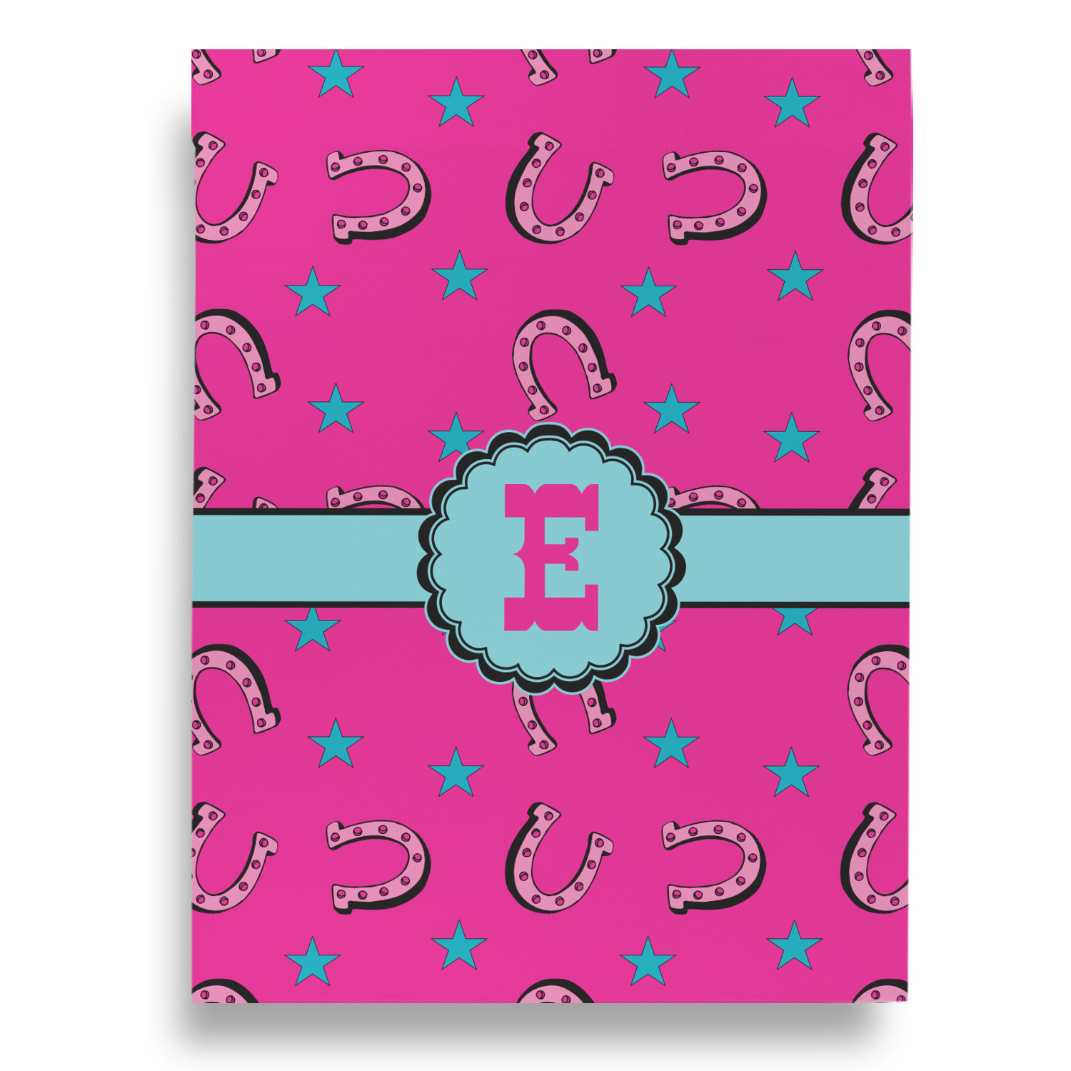 This design has a wild west theme and features a turquoise and pink bandana print on the top half, a pink stripe across the middle, and cowgirl boots and flowers on the bottom. The coordinating design is hot pink, has a turquoise stripe and scalloped circle in the middle, and horseshoes in the background print.
