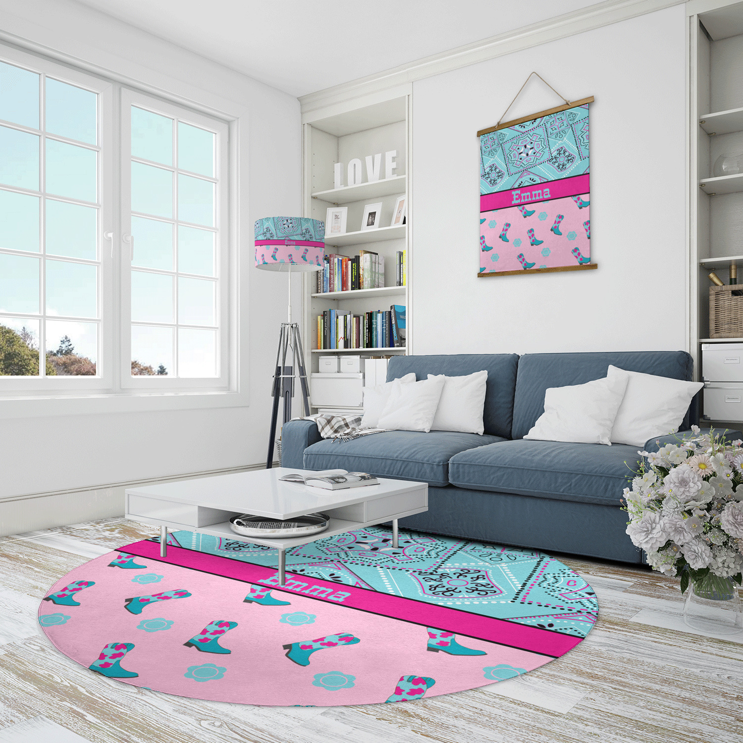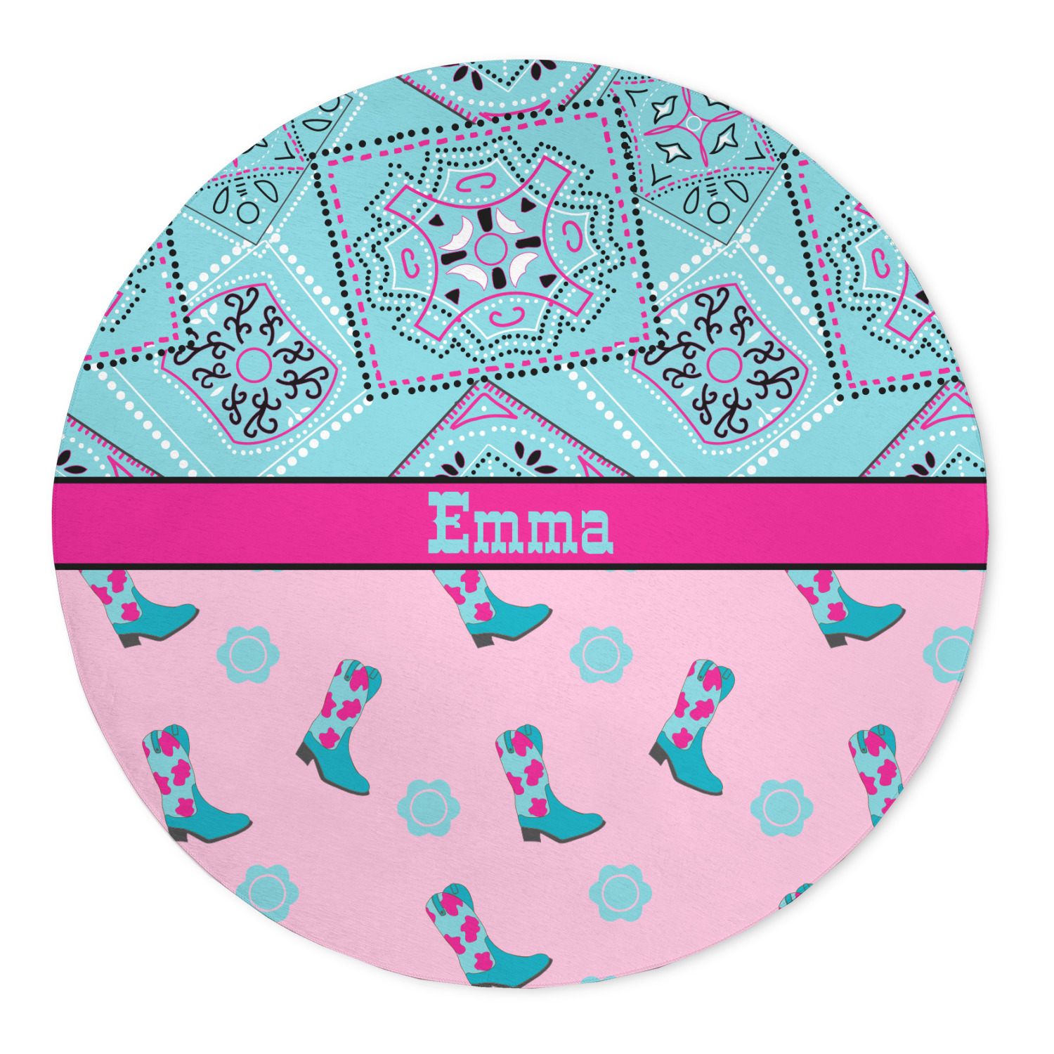 This design has a wild west theme and features a turquoise and pink bandana print on the top half, a pink stripe across the middle, and cowgirl boots and flowers on the bottom. The coordinating design is hot pink, has a turquoise stripe and scalloped circle in the middle, and horseshoes in the background print.