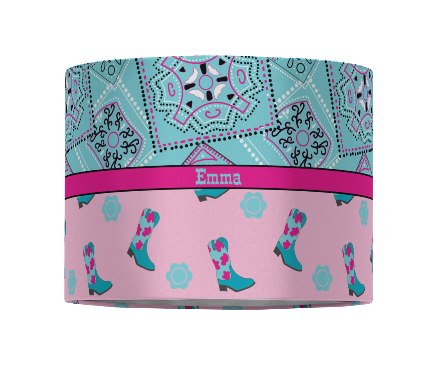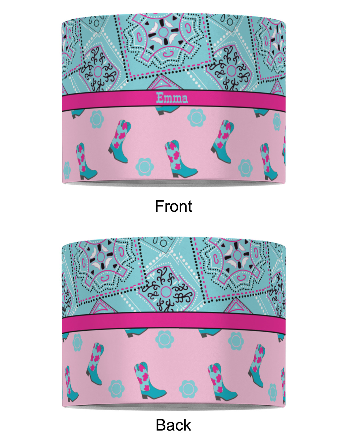 This design has a wild west theme and features a turquoise and pink bandana print on the top half, a pink stripe across the middle, and cowgirl boots and flowers on the bottom. The coordinating design is hot pink, has a turquoise stripe and scalloped circle in the middle, and horseshoes in the background print.