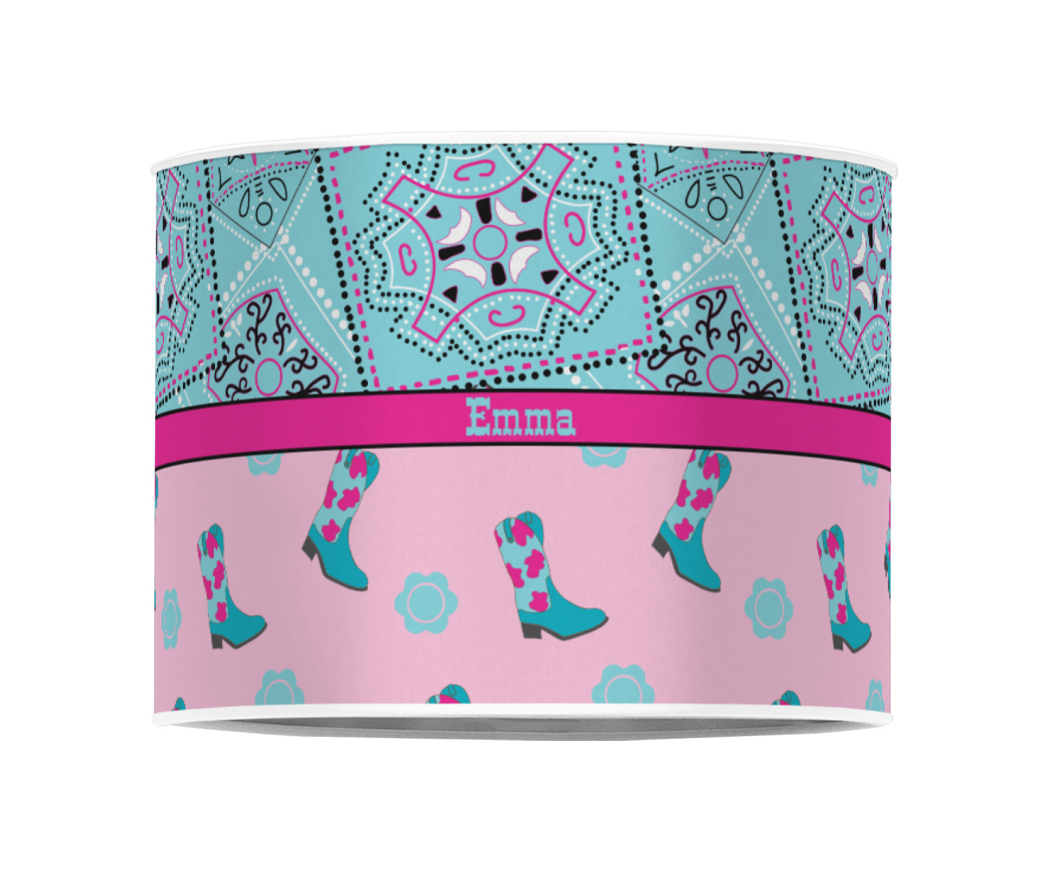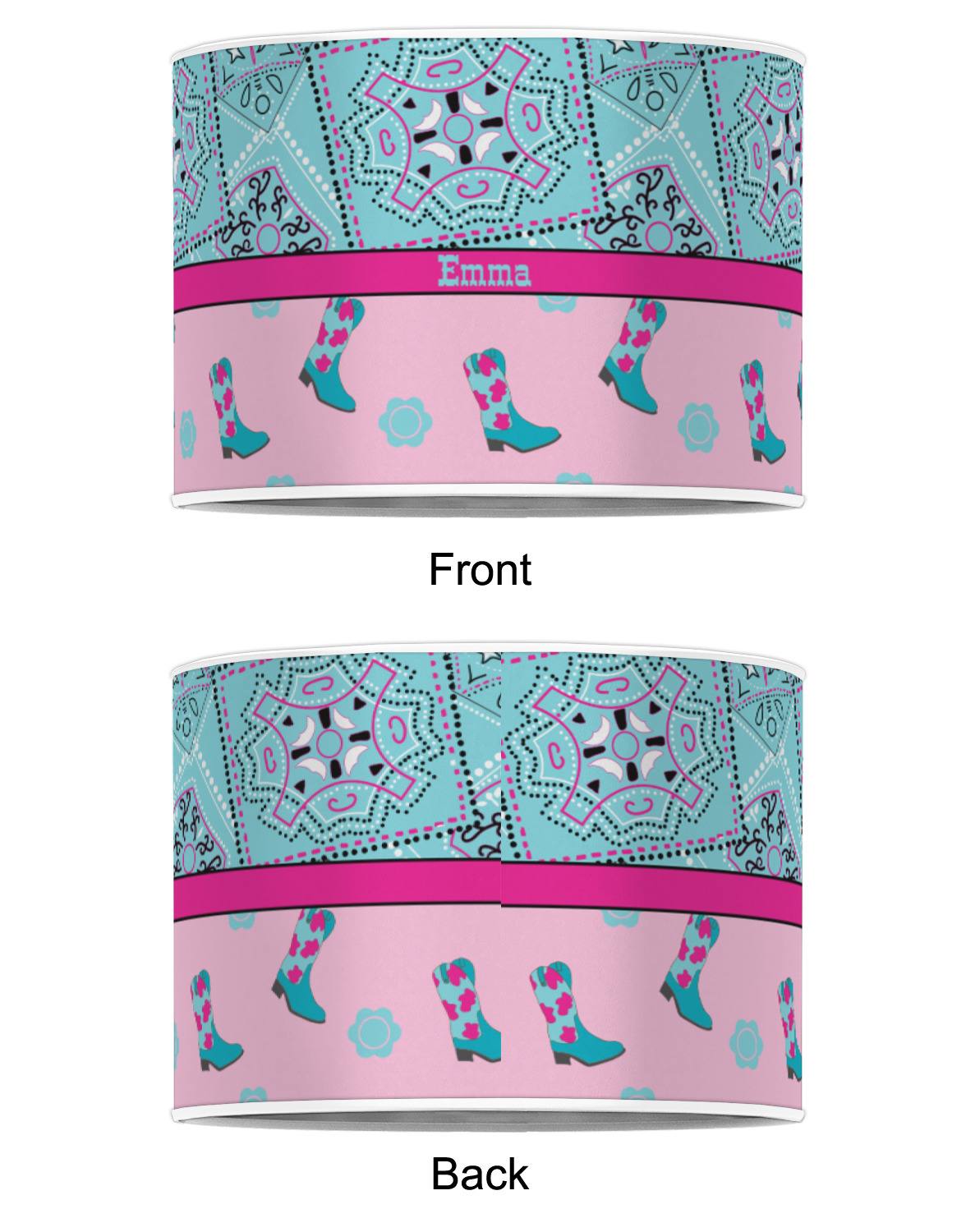 This design has a wild west theme and features a turquoise and pink bandana print on the top half, a pink stripe across the middle, and cowgirl boots and flowers on the bottom. The coordinating design is hot pink, has a turquoise stripe and scalloped circle in the middle, and horseshoes in the background print.