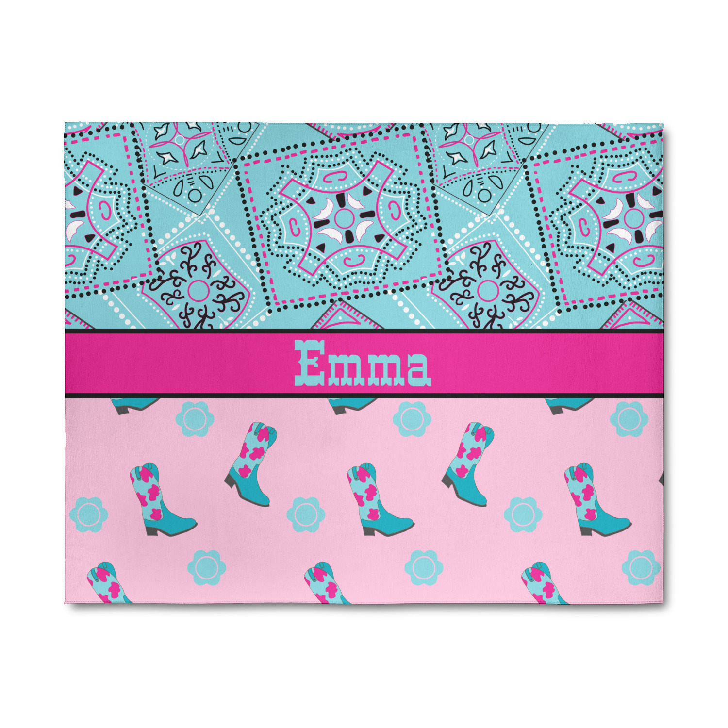 This design has a wild west theme and features a turquoise and pink bandana print on the top half, a pink stripe across the middle, and cowgirl boots and flowers on the bottom. The coordinating design is hot pink, has a turquoise stripe and scalloped circle in the middle, and horseshoes in the background print.