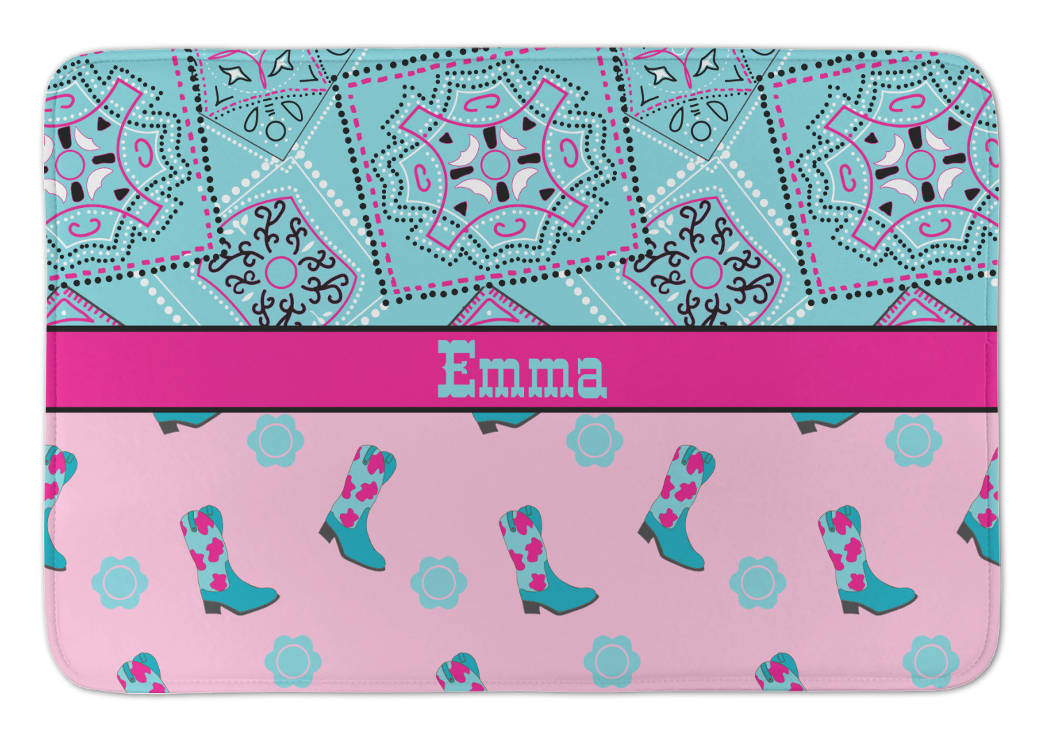 This design has a wild west theme and features a turquoise and pink bandana print on the top half, a pink stripe across the middle, and cowgirl boots and flowers on the bottom. The coordinating design is hot pink, has a turquoise stripe and scalloped circle in the middle, and horseshoes in the background print.