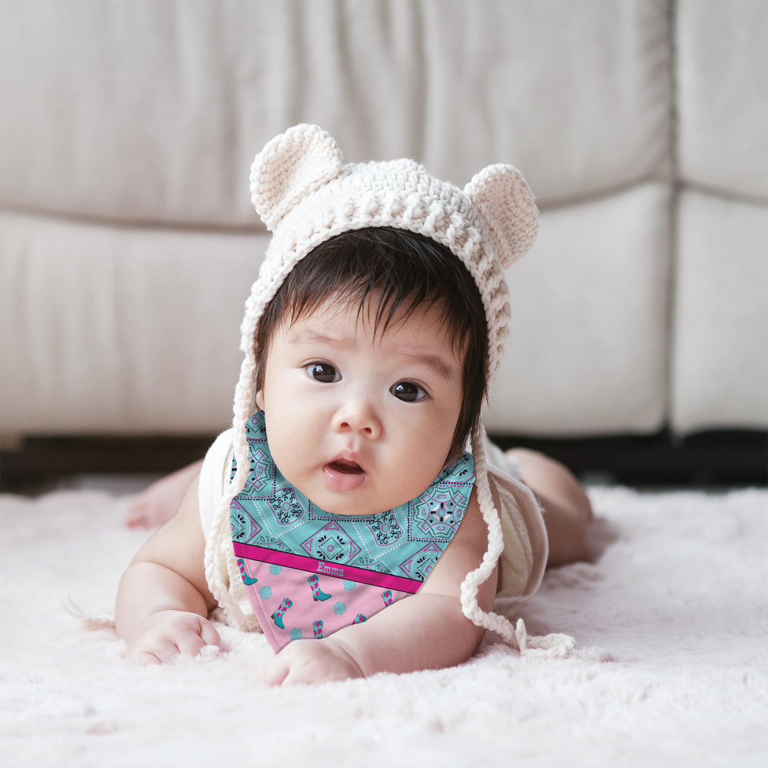 This design has a wild west theme and features a turquoise and pink bandana print on the top half, a pink stripe across the middle, and cowgirl boots and flowers on the bottom. The coordinating design is hot pink, has a turquoise stripe and scalloped circle in the middle, and horseshoes in the background print.