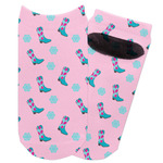 This design has a wild west theme and features a turquoise and pink bandana print on the top half, a pink stripe across the middle, and cowgirl boots and flowers on the bottom. The coordinating design is hot pink, has a turquoise stripe and scalloped circle in the middle, and horseshoes in the background print.