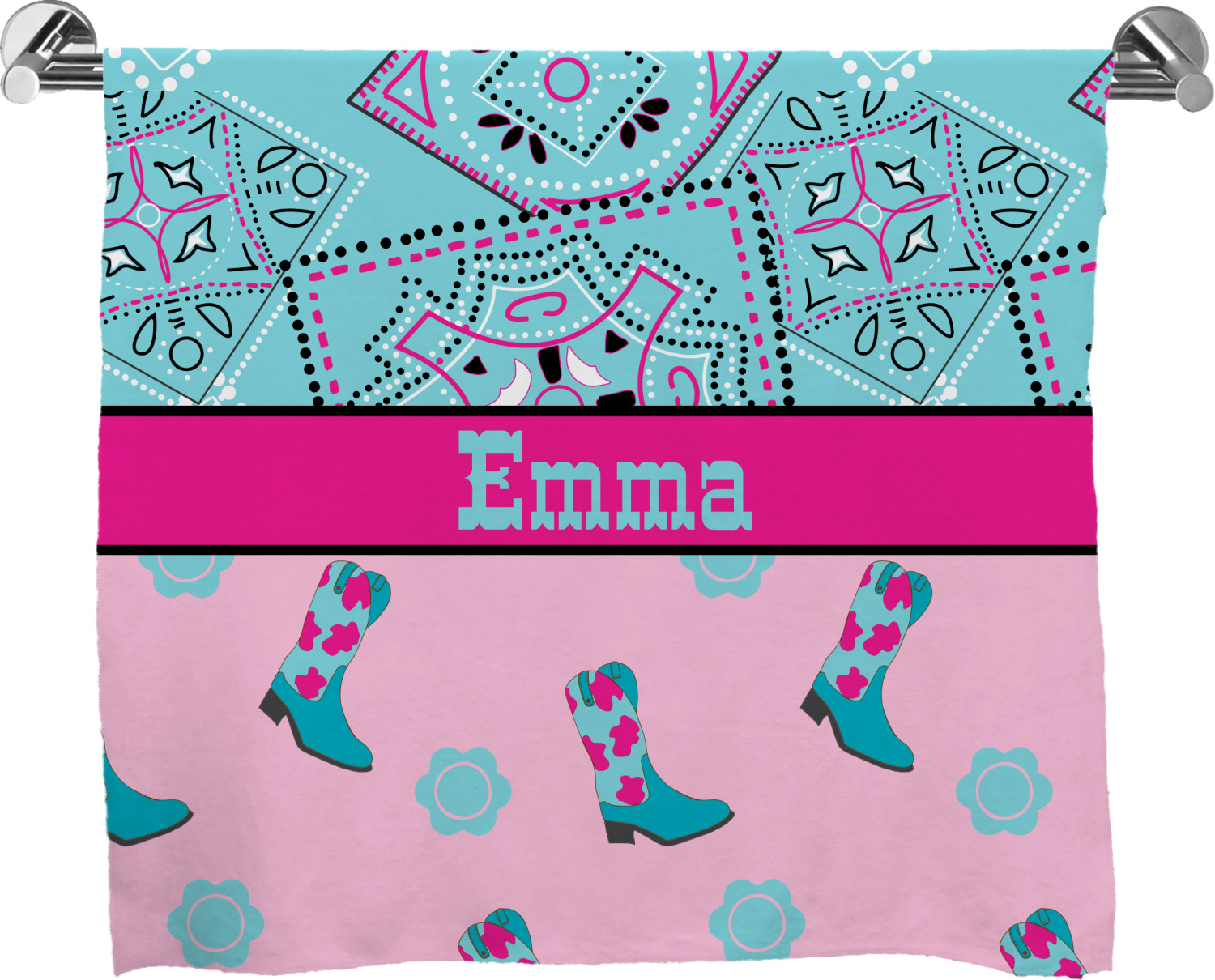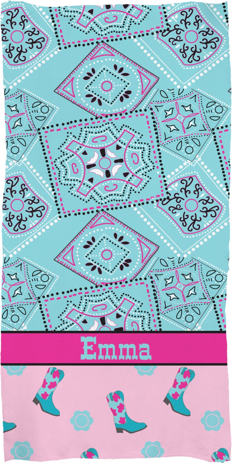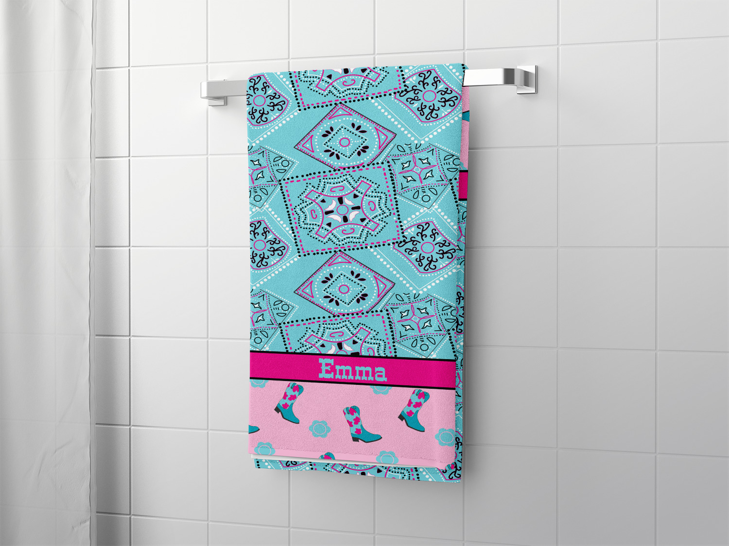 This design has a wild west theme and features a turquoise and pink bandana print on the top half, a pink stripe across the middle, and cowgirl boots and flowers on the bottom. The coordinating design is hot pink, has a turquoise stripe and scalloped circle in the middle, and horseshoes in the background print.