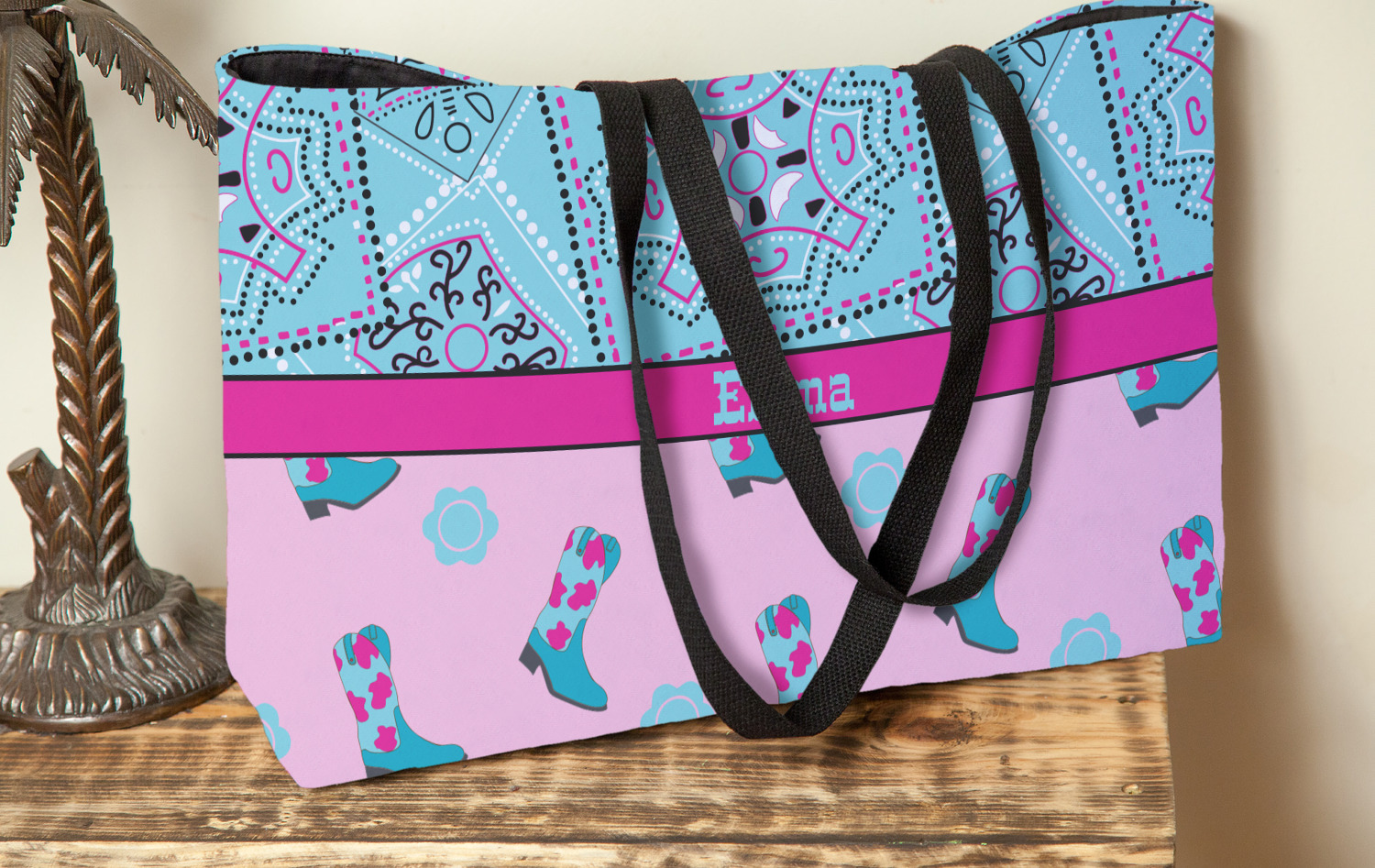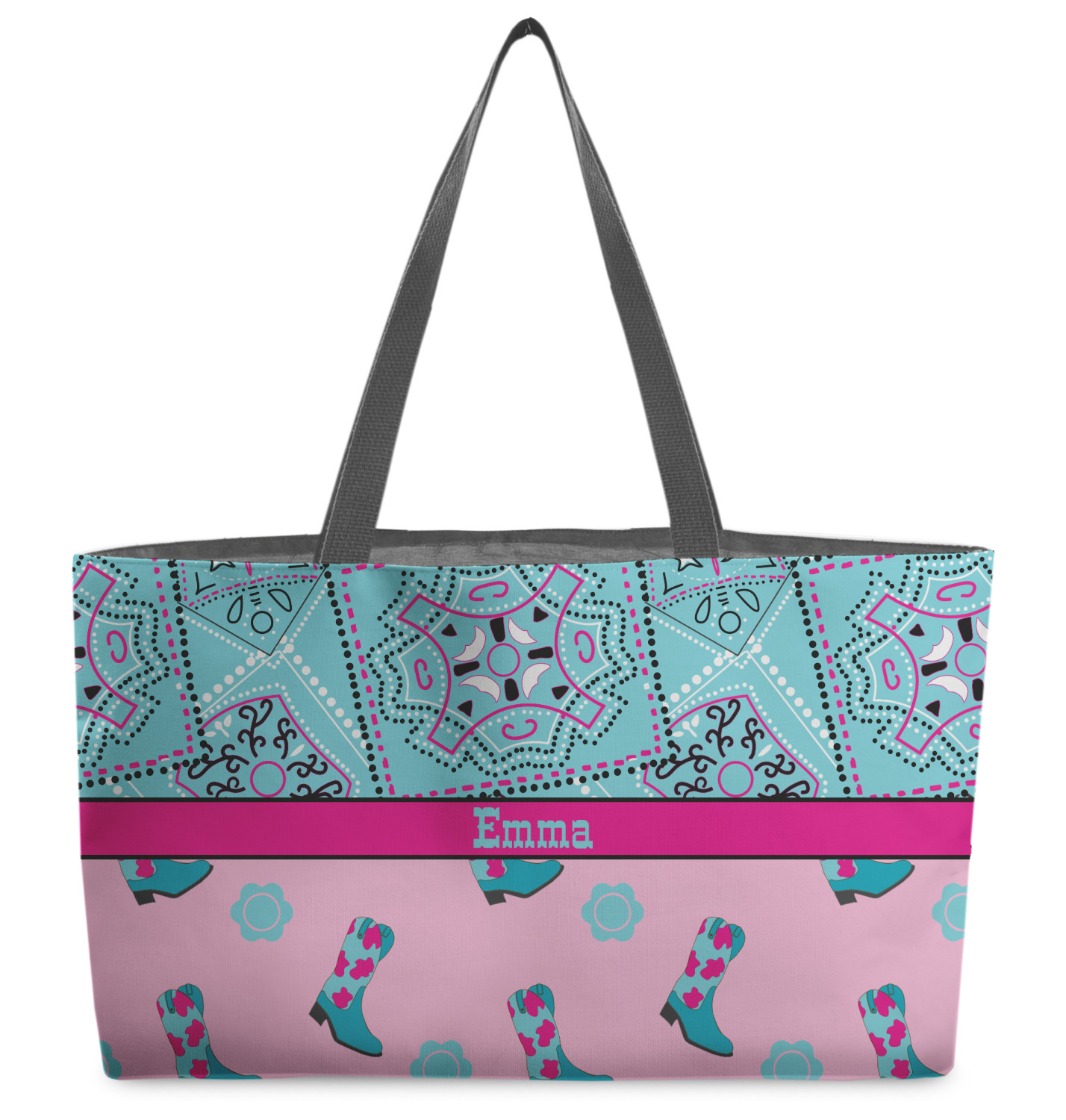This design has a wild west theme and features a turquoise and pink bandana print on the top half, a pink stripe across the middle, and cowgirl boots and flowers on the bottom. The coordinating design is hot pink, has a turquoise stripe and scalloped circle in the middle, and horseshoes in the background print.