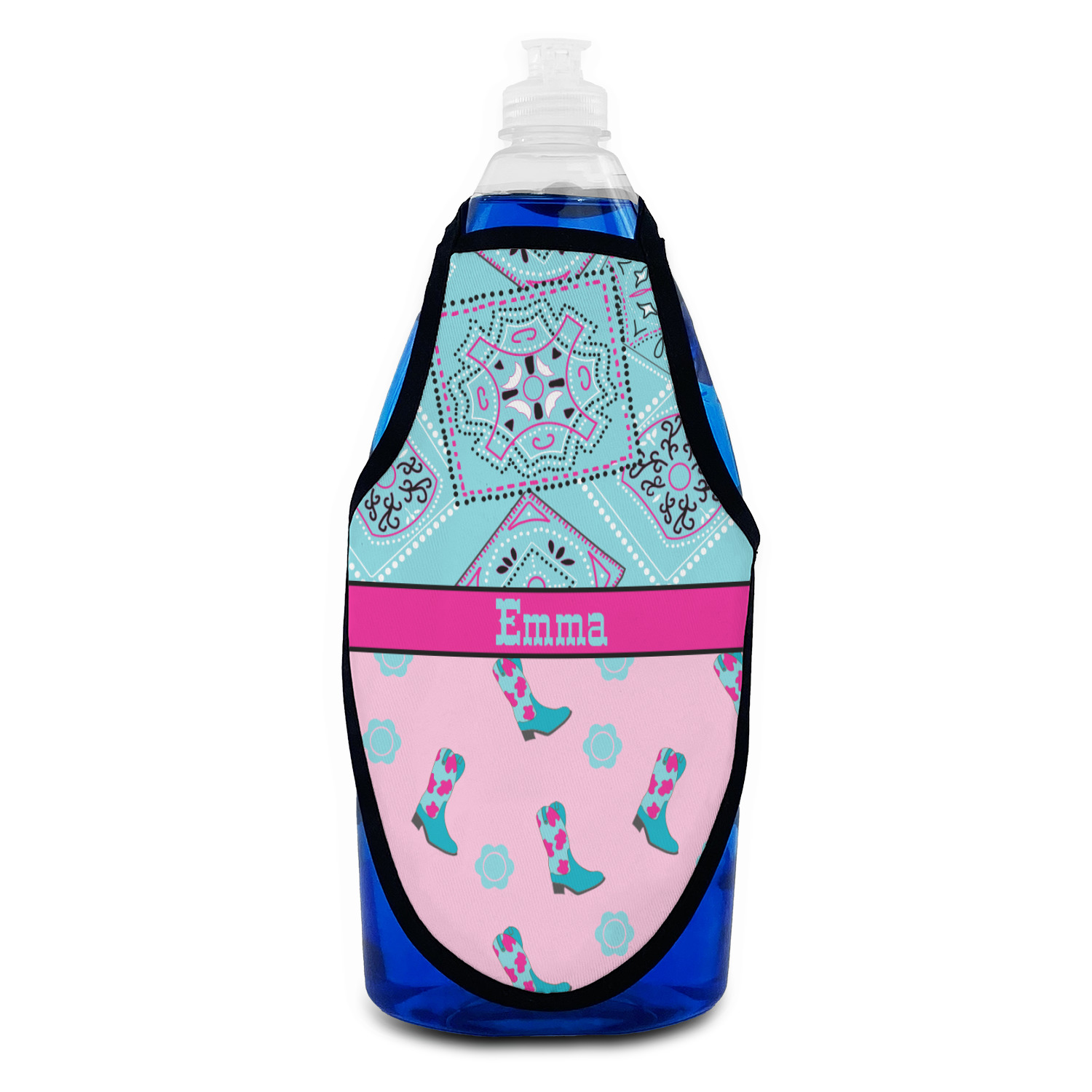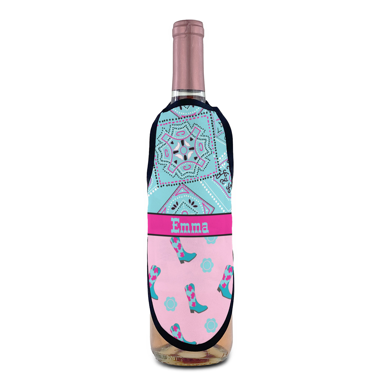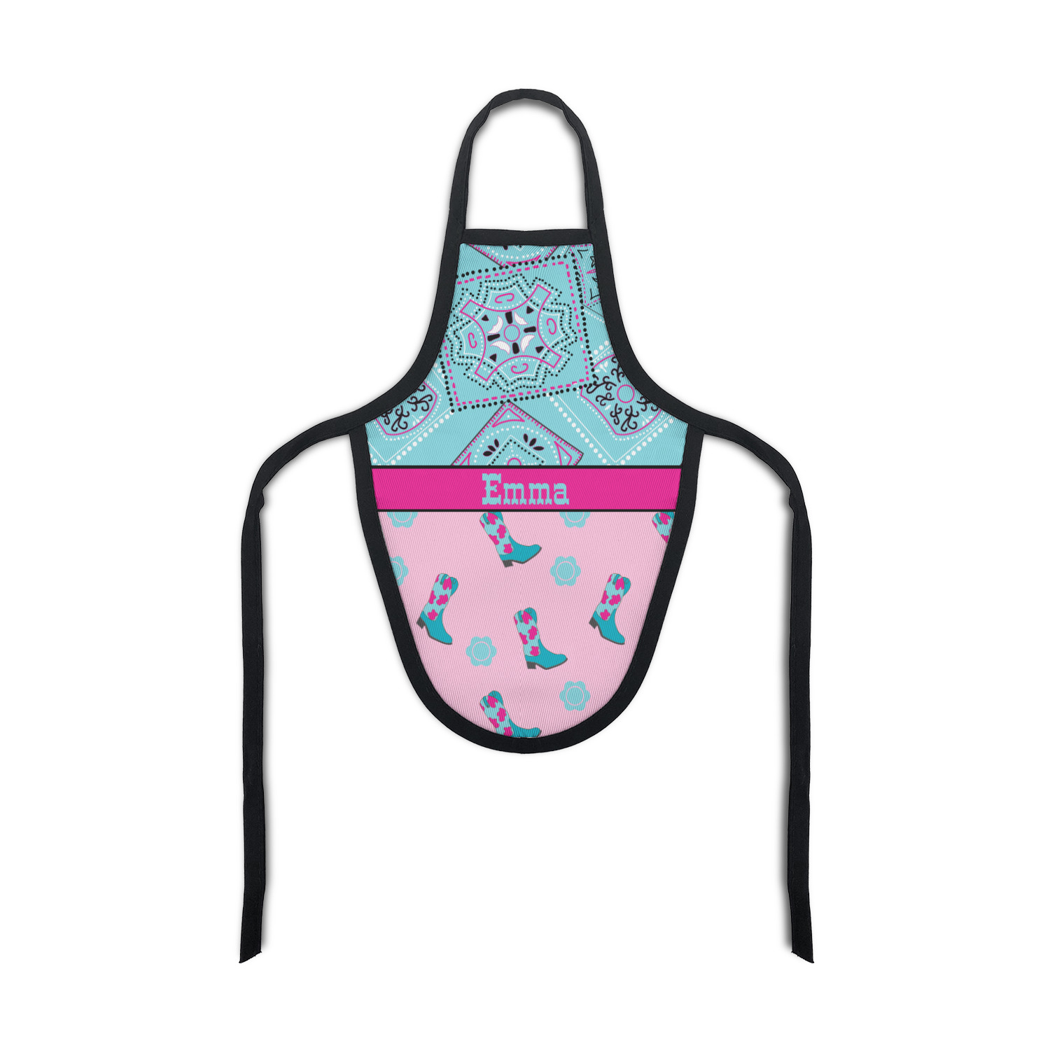 This design has a wild west theme and features a turquoise and pink bandana print on the top half, a pink stripe across the middle, and cowgirl boots and flowers on the bottom. The coordinating design is hot pink, has a turquoise stripe and scalloped circle in the middle, and horseshoes in the background print.