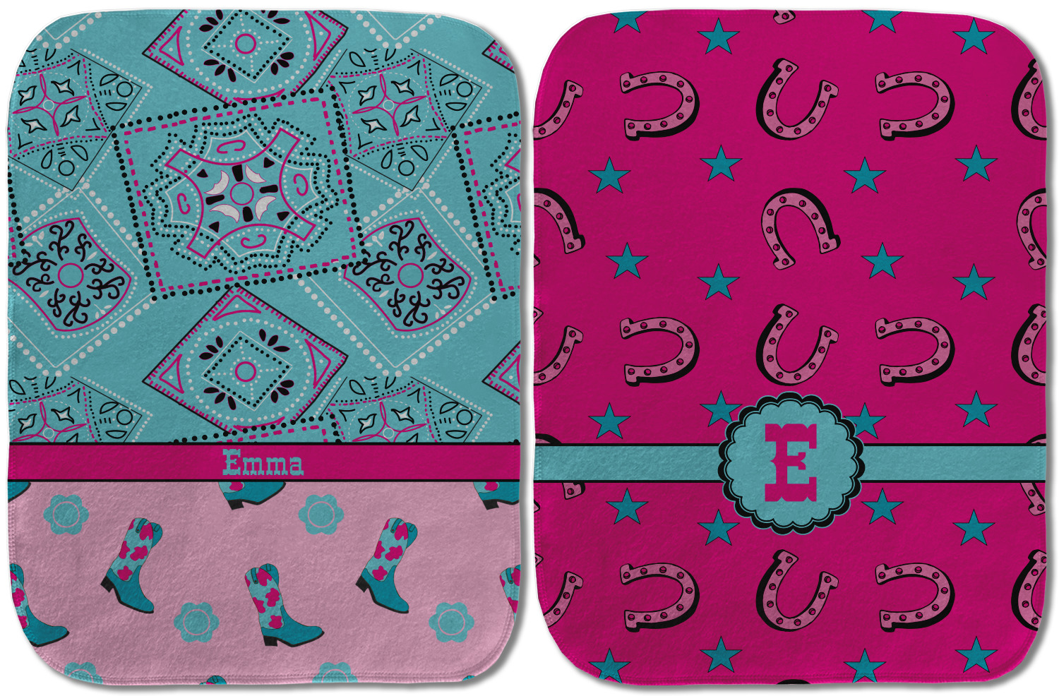 This design has a wild west theme and features a turquoise and pink bandana print on the top half, a pink stripe across the middle, and cowgirl boots and flowers on the bottom. The coordinating design is hot pink, has a turquoise stripe and scalloped circle in the middle, and horseshoes in the background print.