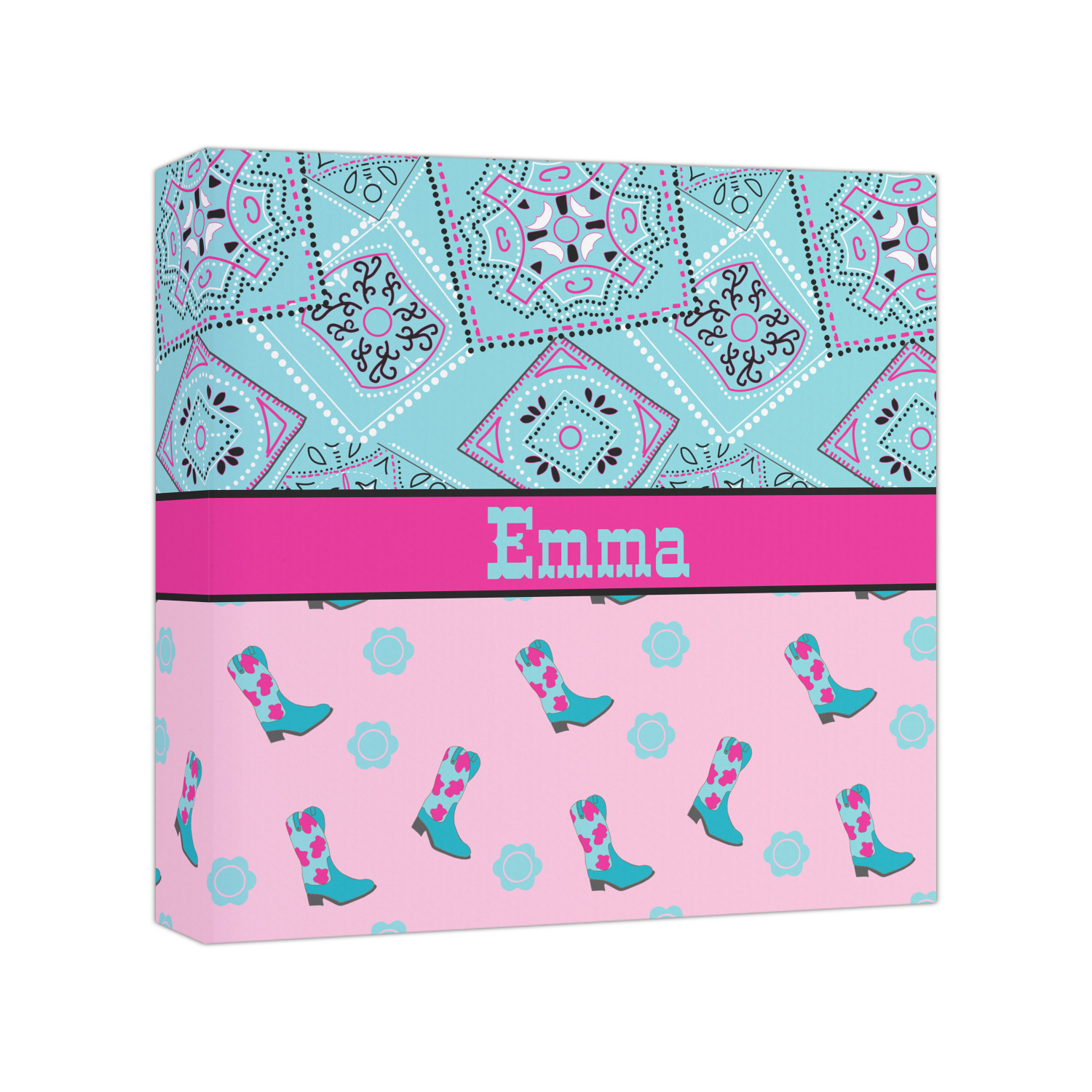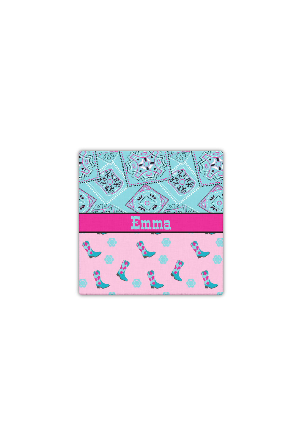 This design has a wild west theme and features a turquoise and pink bandana print on the top half, a pink stripe across the middle, and cowgirl boots and flowers on the bottom. The coordinating design is hot pink, has a turquoise stripe and scalloped circle in the middle, and horseshoes in the background print.
