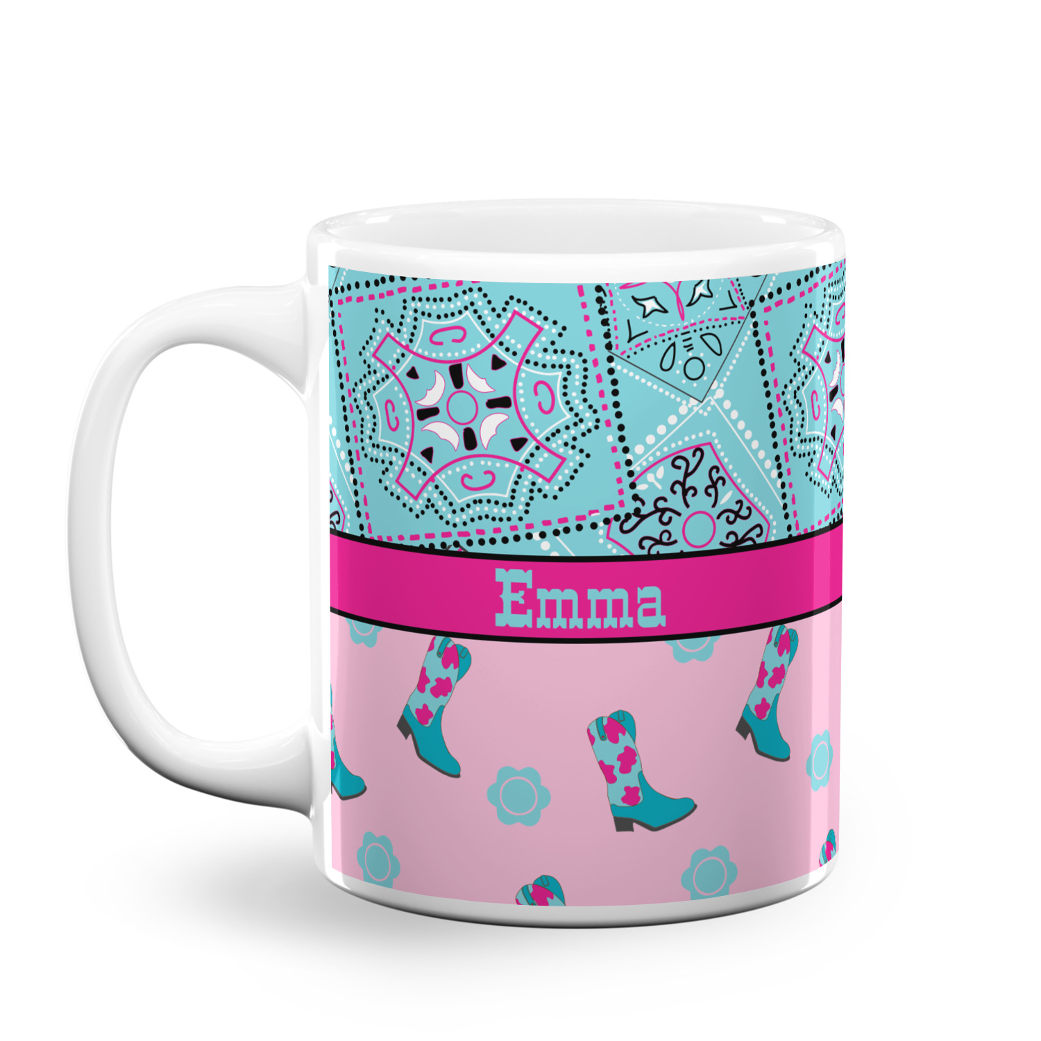 This design has a wild west theme and features a turquoise and pink bandana print on the top half, a pink stripe across the middle, and cowgirl boots and flowers on the bottom. The coordinating design is hot pink, has a turquoise stripe and scalloped circle in the middle, and horseshoes in the background print.