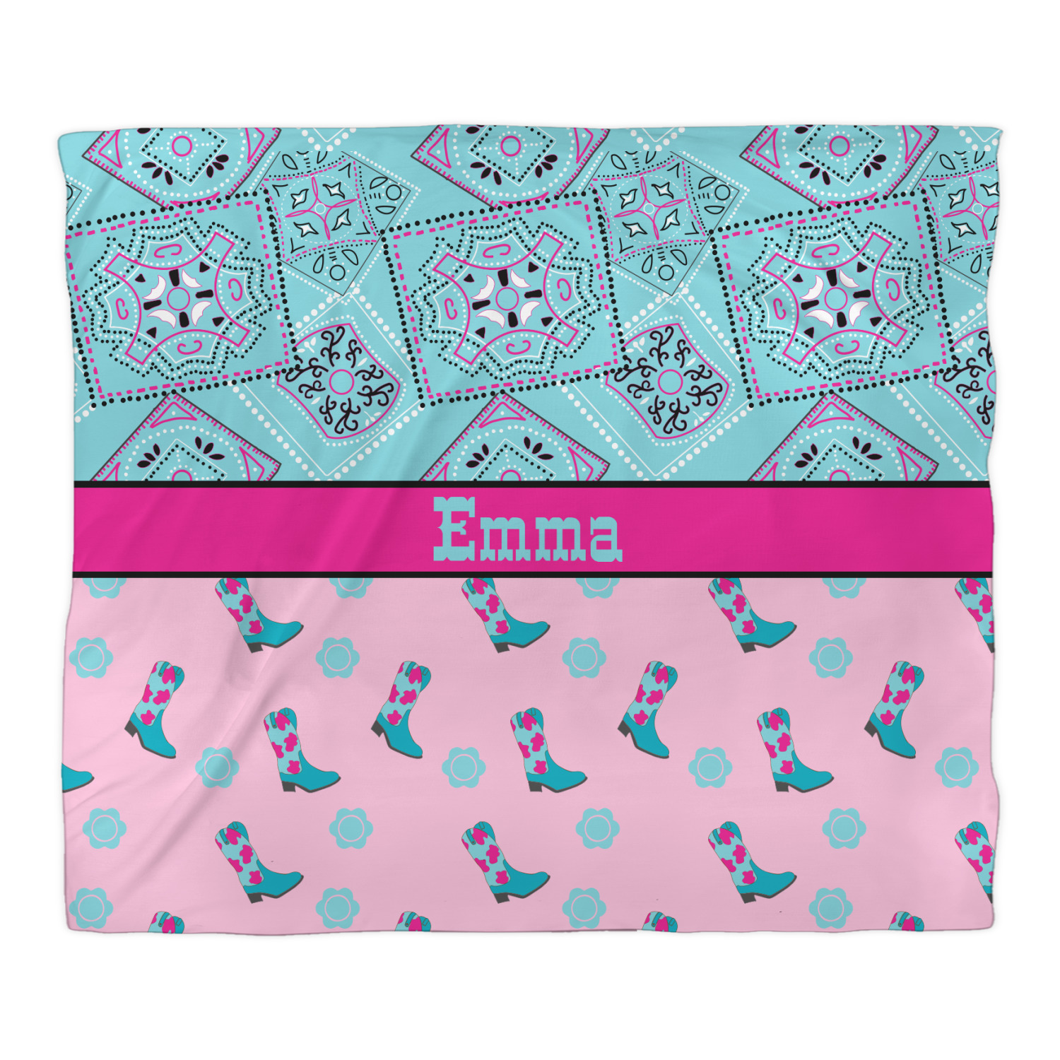 This design has a wild west theme and features a turquoise and pink bandana print on the top half, a pink stripe across the middle, and cowgirl boots and flowers on the bottom. The coordinating design is hot pink, has a turquoise stripe and scalloped circle in the middle, and horseshoes in the background print.