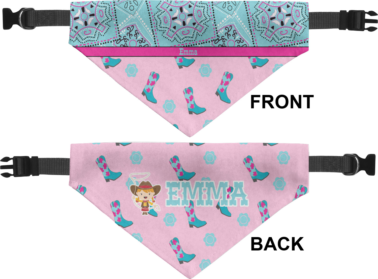We print the front and back of these dog bandanas with your customized design. The bandana itself is made from a durable polyester, sewn together with a gap large enough to accommodate any collar. Regardless, the bandana includes a plain black, canvas collar with plastic snaps, that can easily be removed if desired. These dog bandana collars are available in four sizes: small, medium, large, and extra large. Please see our sizing chart for more information regarding the dimensions of each size.