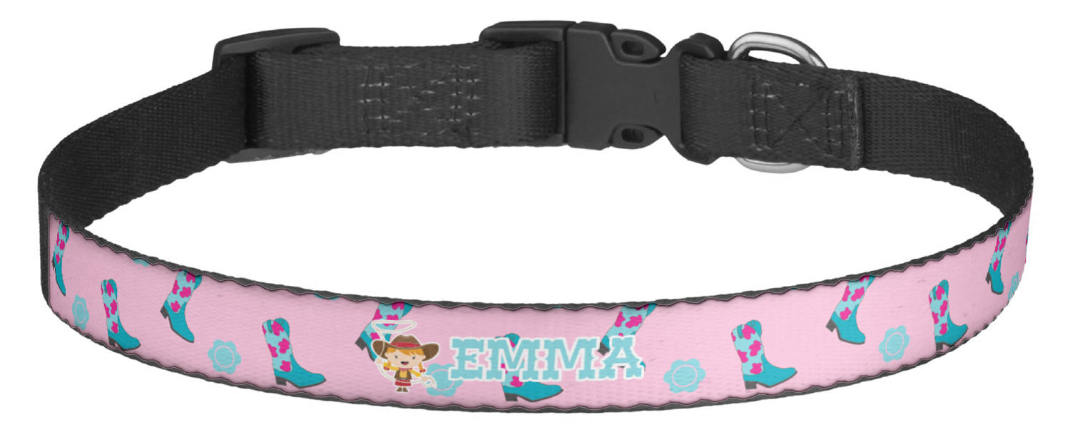 This sturdy collar, made from a durable nylon weave, will outlive your dog's episodes of excited tugging and pulling. Courtesy of its thick plastic buckle and adjuster, this collar is adjustable and accommodating of any dog. Structurally, the collar is a single piece of nylon weave that is sewn together, and features a solid metal loop where you can attach a leash or dog tag. We print and display your dog's name and pattern across the middle of the personalized dog collar.