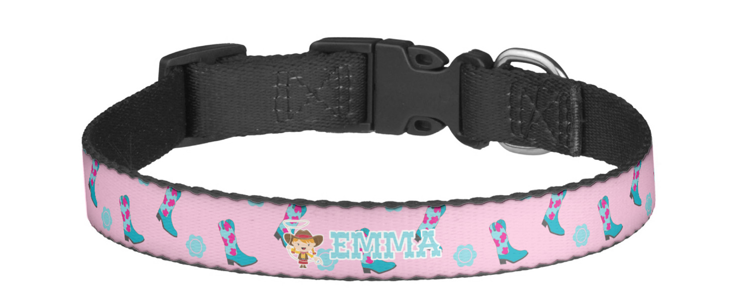 This sturdy collar, made from a durable nylon weave, will outlive your dog's episodes of excited tugging and pulling. Courtesy of its thick plastic buckle and adjuster, this collar is adjustable and accommodating of any dog. Structurally, the collar is a single piece of nylon weave that is sewn together, and features a solid metal loop where you can attach a leash or dog tag. We print and display your dog's name and pattern across the middle of the personalized dog collar.