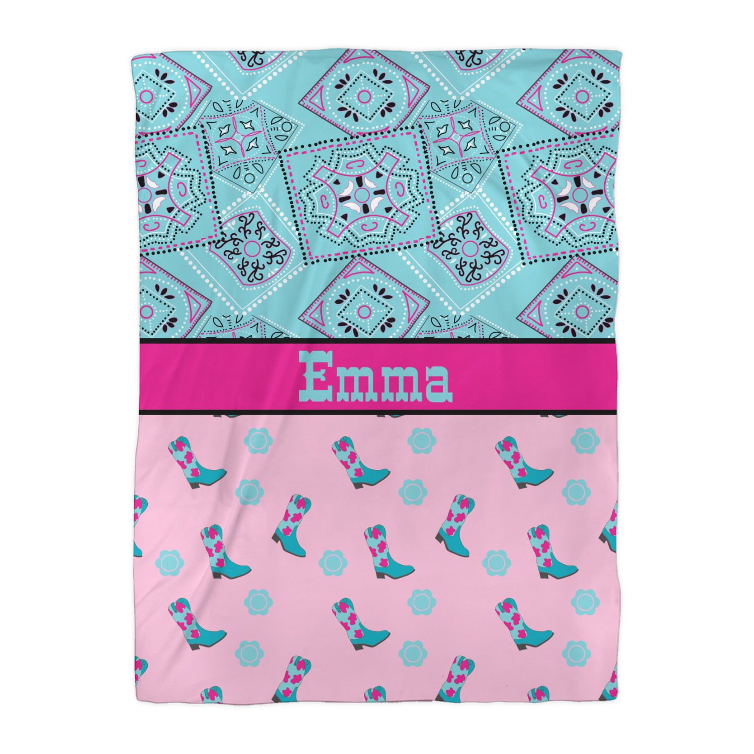 This design has a wild west theme and features a turquoise and pink bandana print on the top half, a pink stripe across the middle, and cowgirl boots and flowers on the bottom. The coordinating design is hot pink, has a turquoise stripe and scalloped circle in the middle, and horseshoes in the background print.